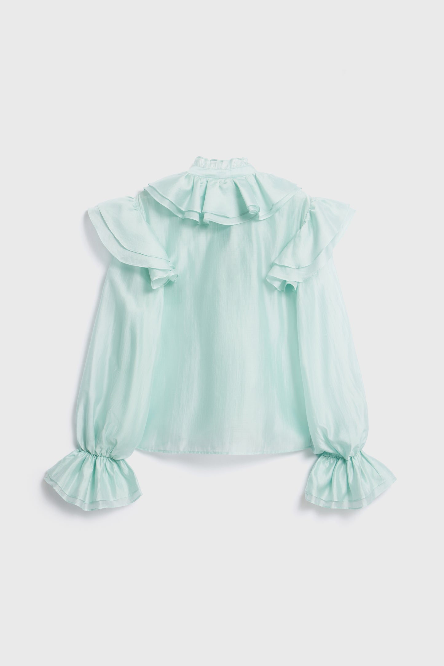 Straight-fit blouse in an airy, sheer weave made of lyocell blend. Ruffled collar and wide flounces. Open front with a pair of narrow ties. Long sleeves with ruffle-trimmed, elasticized cuffs. Unlined.