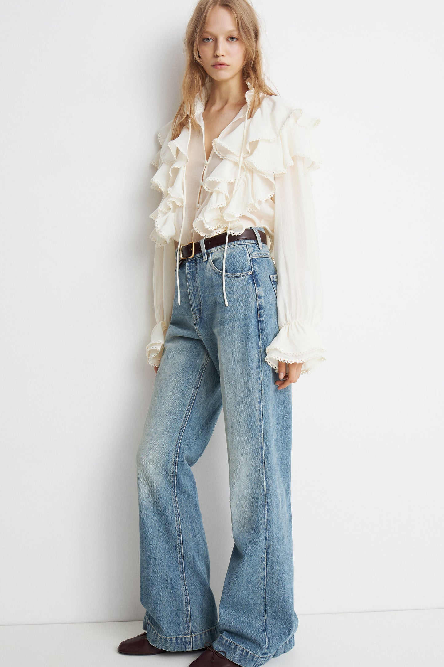 Loose-fit blouse in an airy lyocell blend with ruffles and lace insert. Ruffled collar features narrow ties. Long sleeves with ruffle-trimmed, elasticized cuffs. Covered buttons at front.