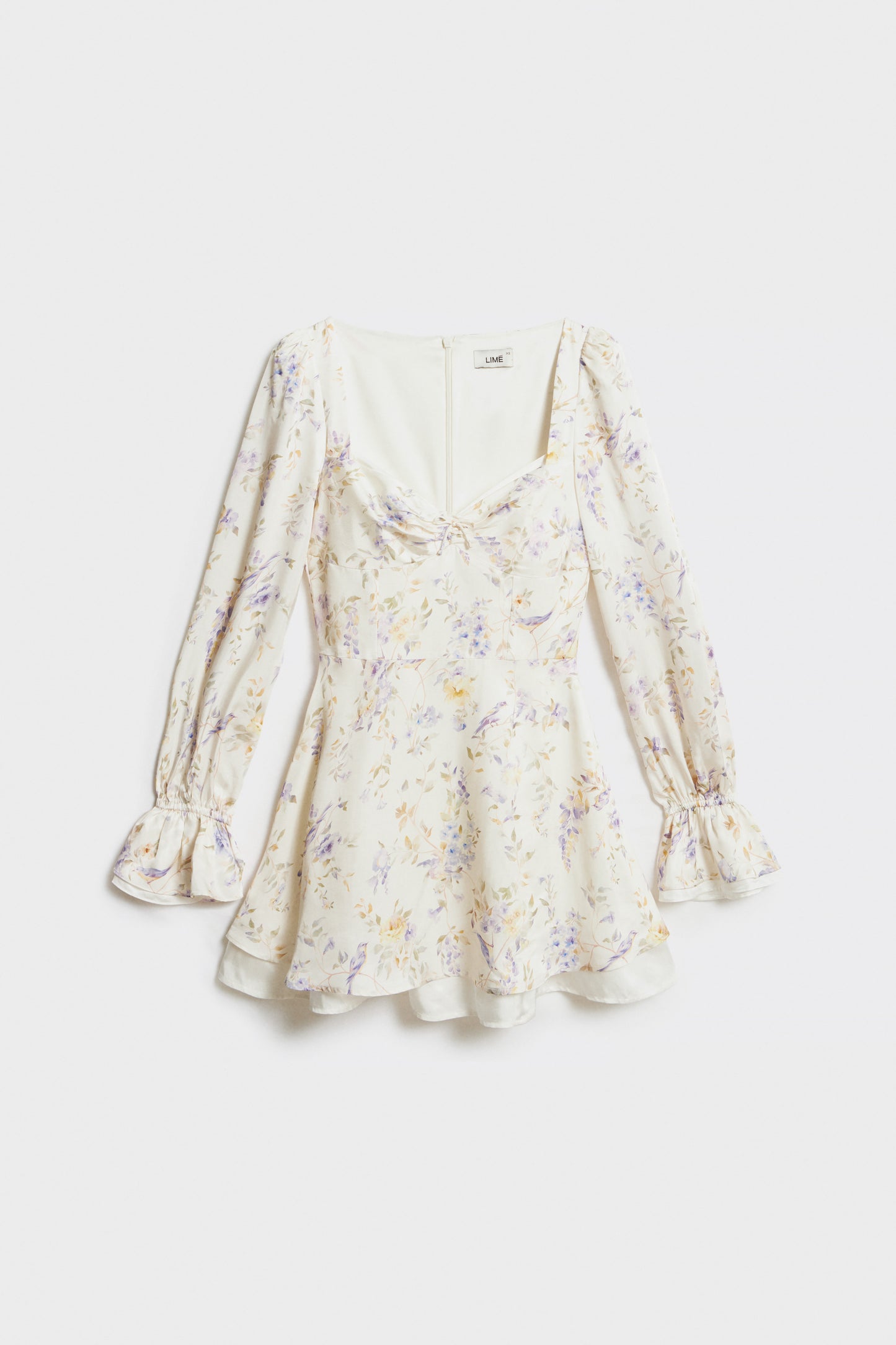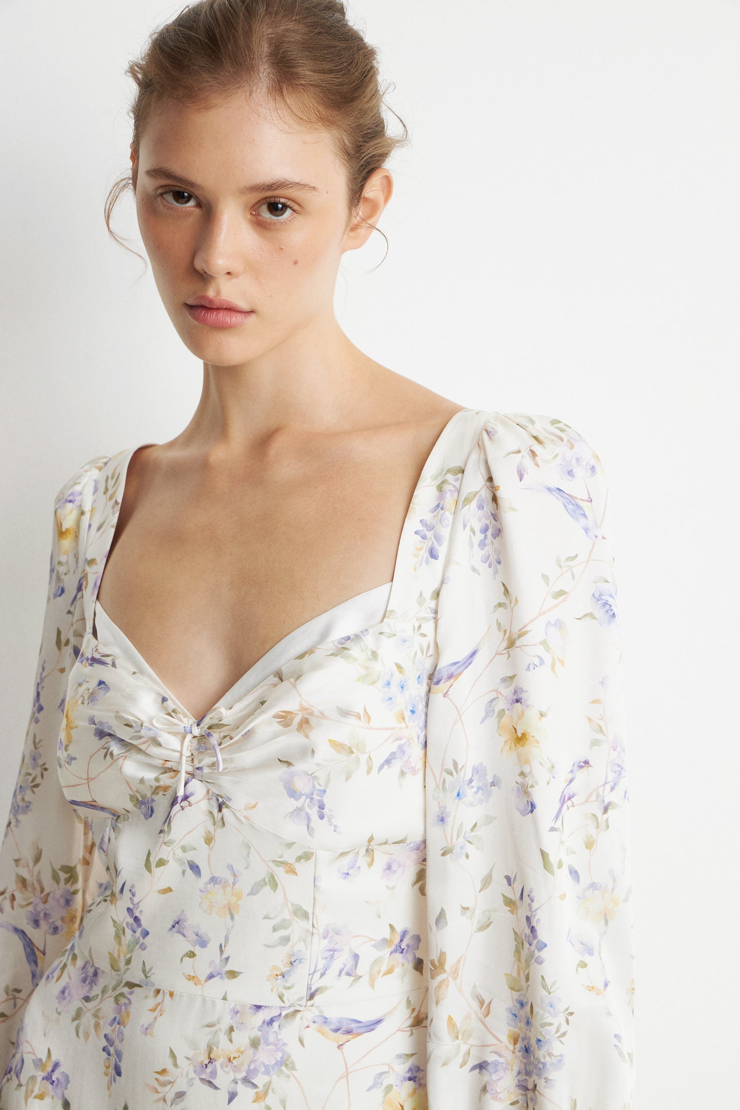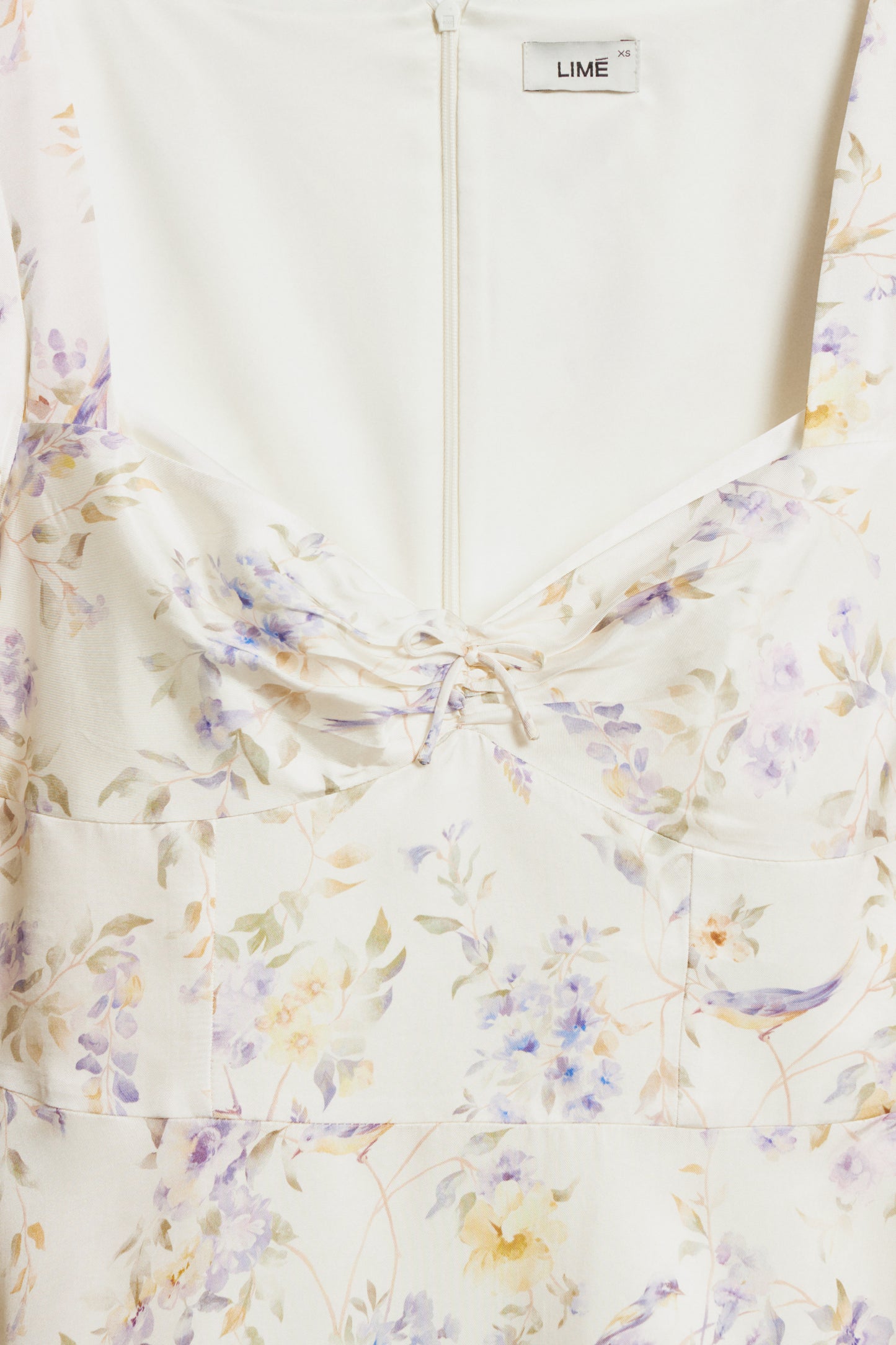 This mini dress crafted from high-shine printed satin and designed with a corset-like neckline with drawstring, a fitted body, seam details and bust darts. Lined. A concealed zip at the back.