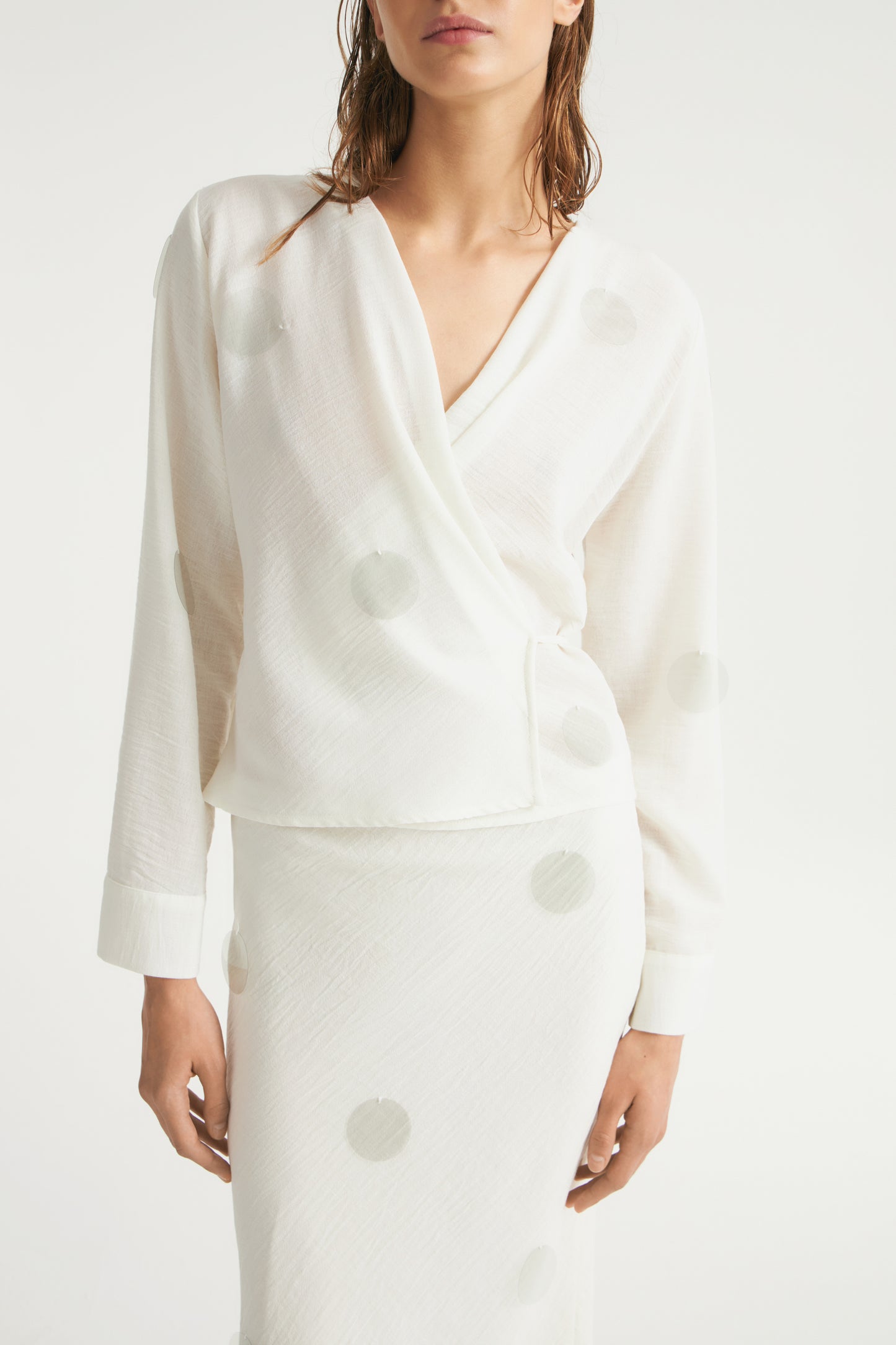 Blouse in textured weave with all-over transparent sequins. Long sleeves, V-neck and wrap front with extra-narrow ties that going around the waist and tie at the back.
