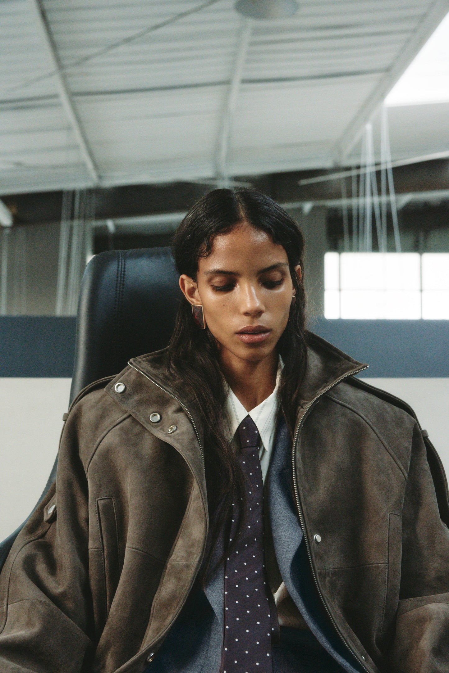 Loose-fit, slim fit jacket in soft suede leather featuring a high collar, long sleeves, shoulder tabs with snap-buttons and discreet side pockets. Lined. Front zip fastenings hidden by a placket. Keep you warm when the temperature < +15℃
