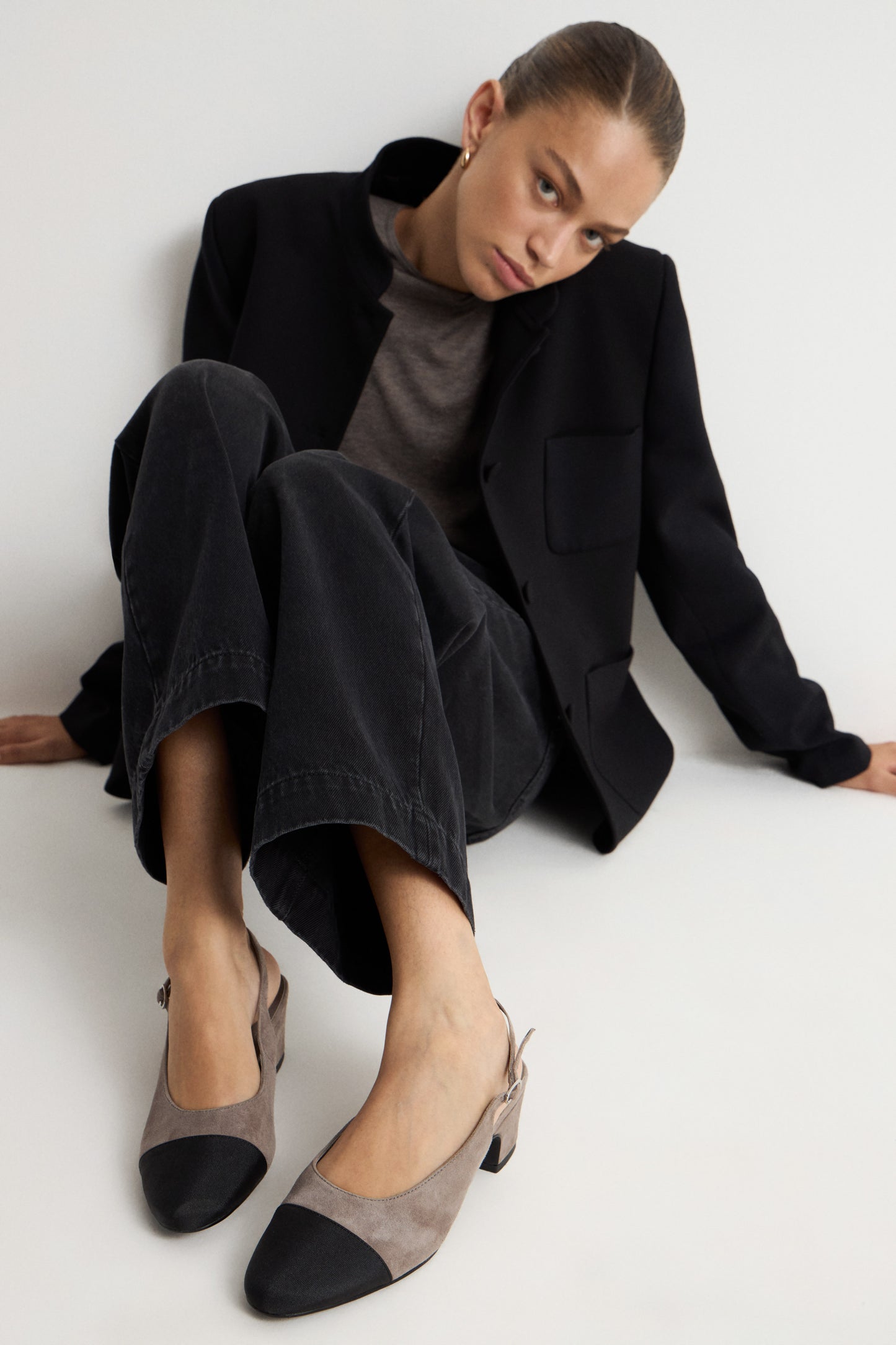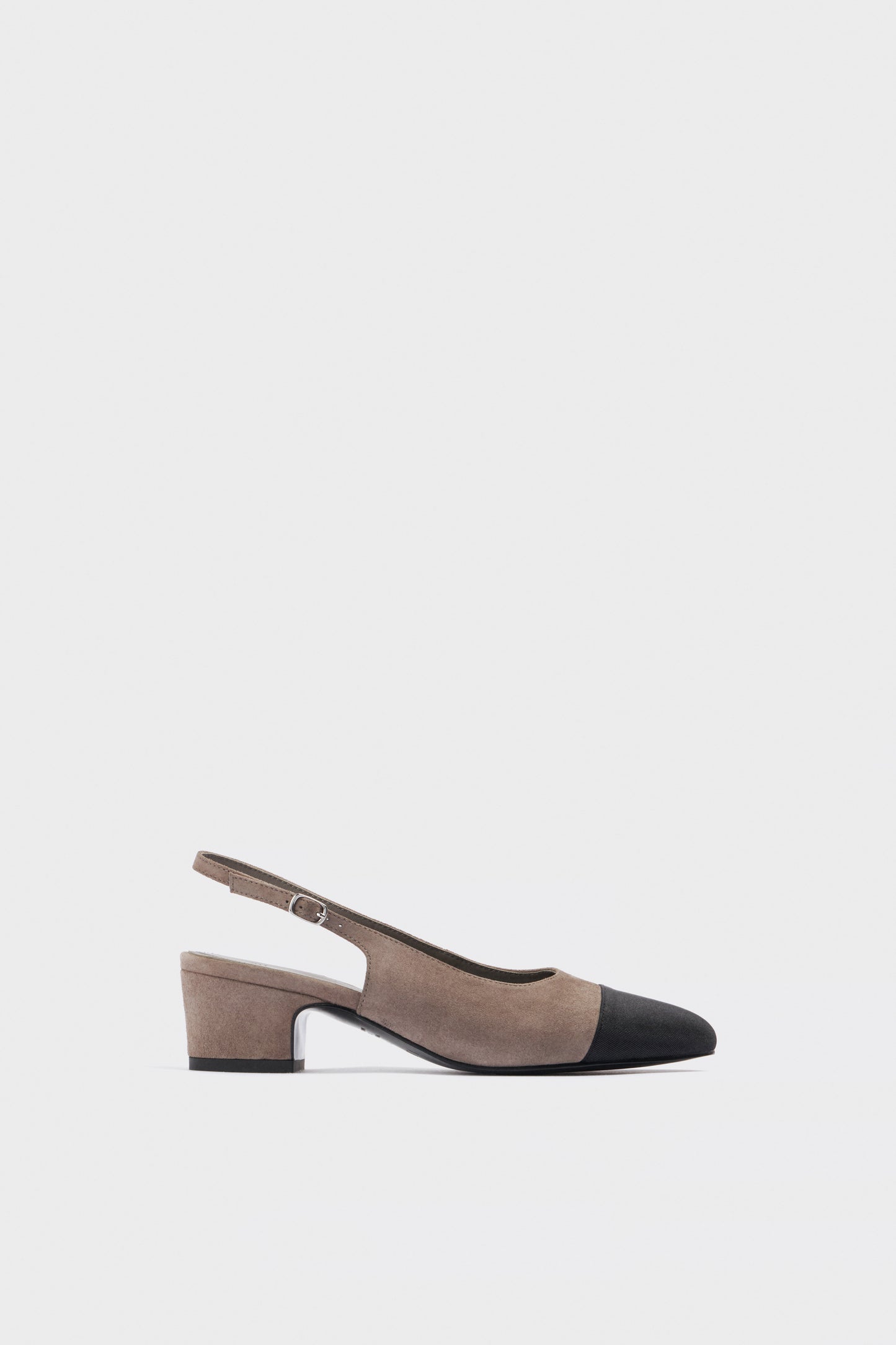 Sheep suede leather slingback shoes. Rounded toes and block covered heels. Leather linings and insoles. Fastens with a back strap and metal buckle. Your purchases are delivered with a fabric bag.