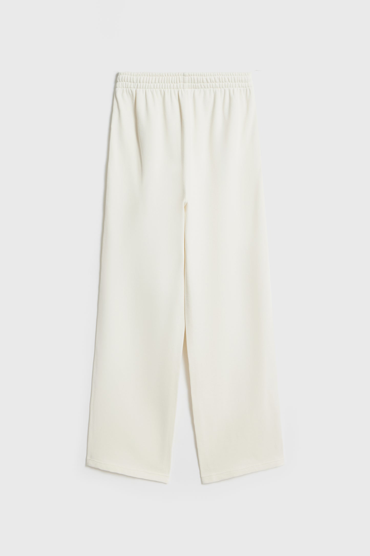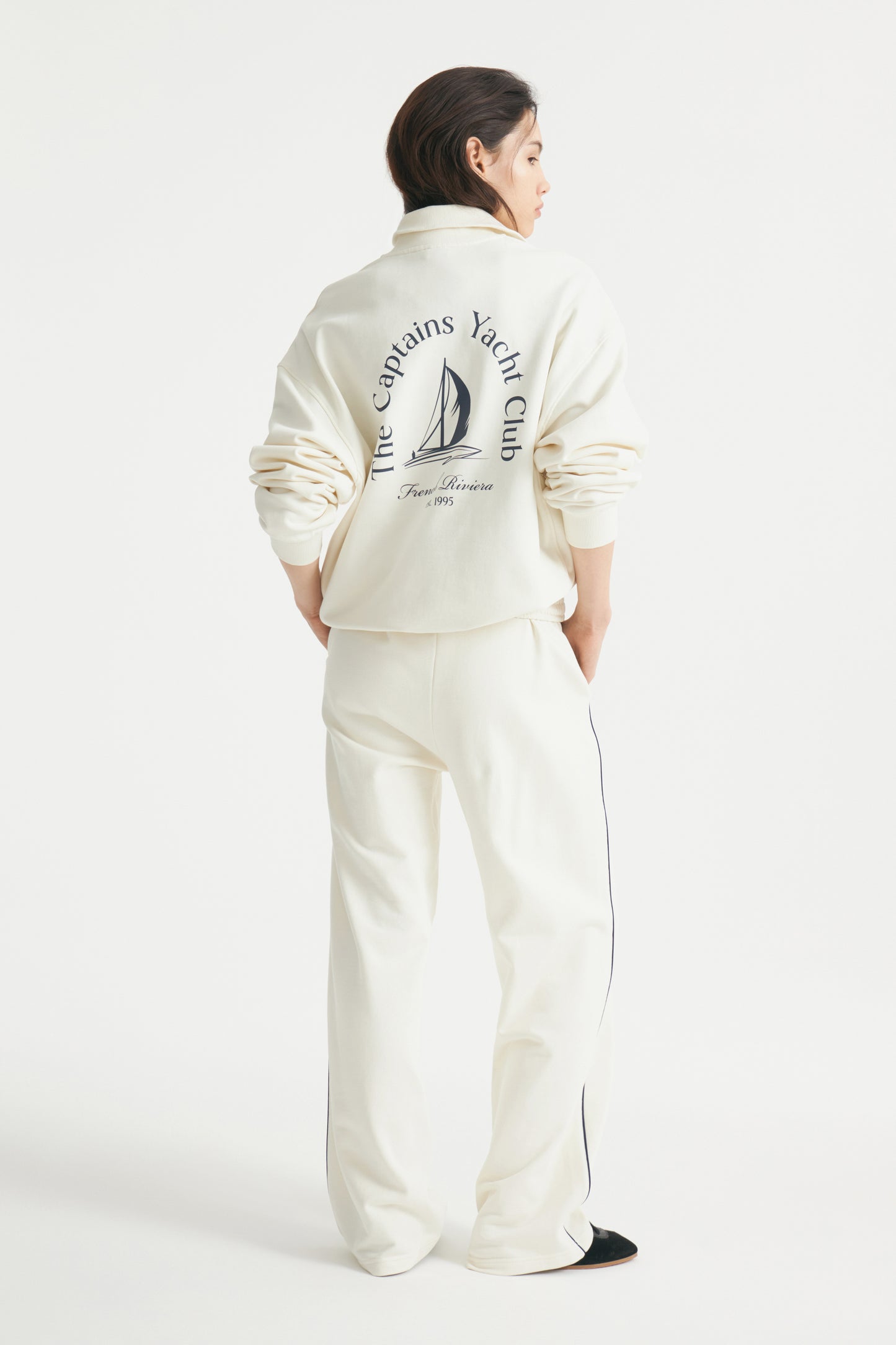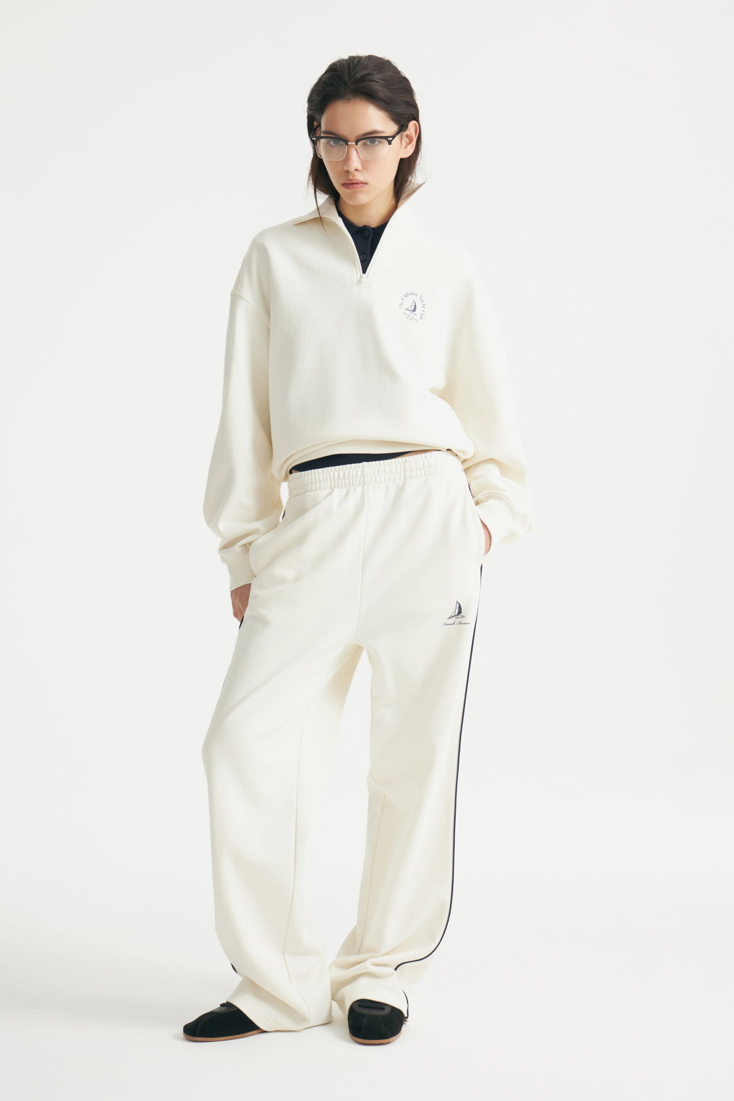 Crafted from cotton terry trousers featuring an elasticated, drawstring waist, discreet pockets in the side seams. Straight legs, side stripes with contrast piping and a text motif.