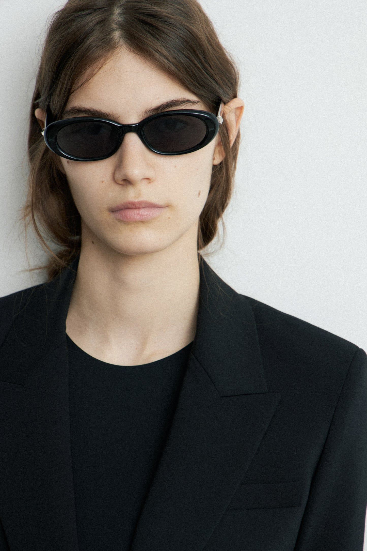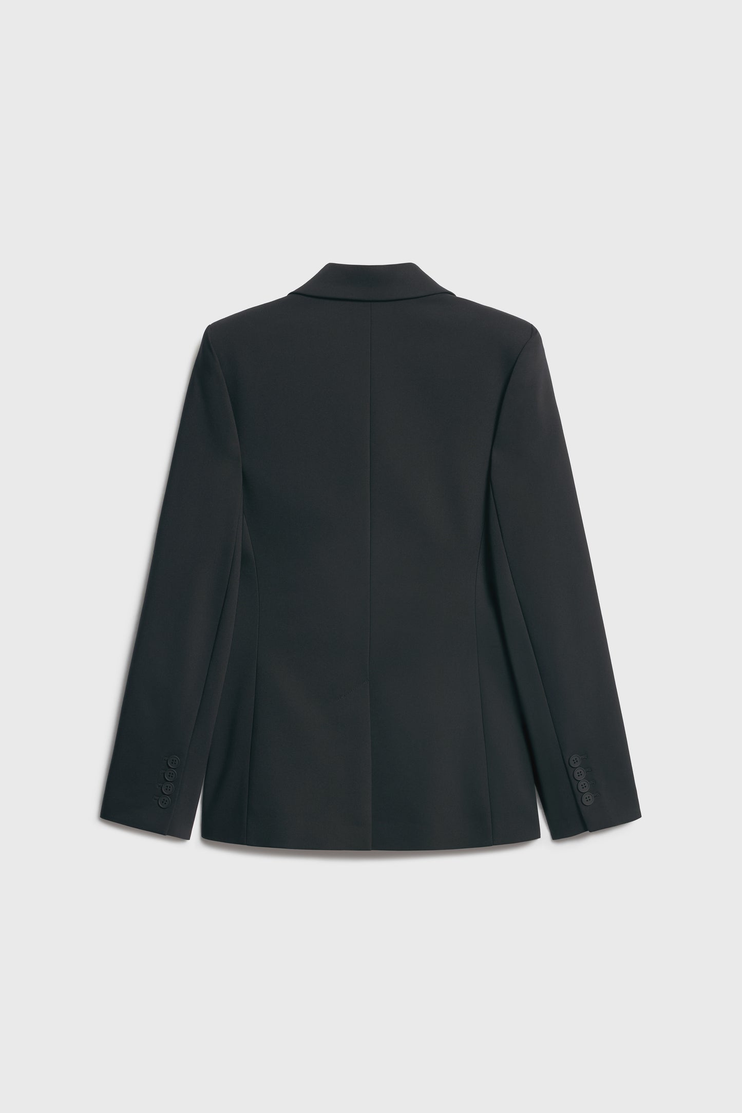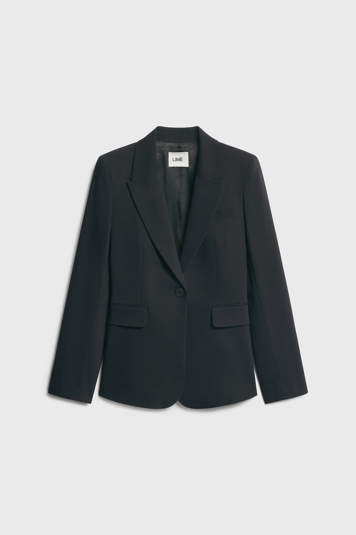Tailored blazer featuring a lapel collar and long sleeves with shoulder pads. Front pockets with flaps, fake chest pocket. Matching lining. Single-breasted front with button.