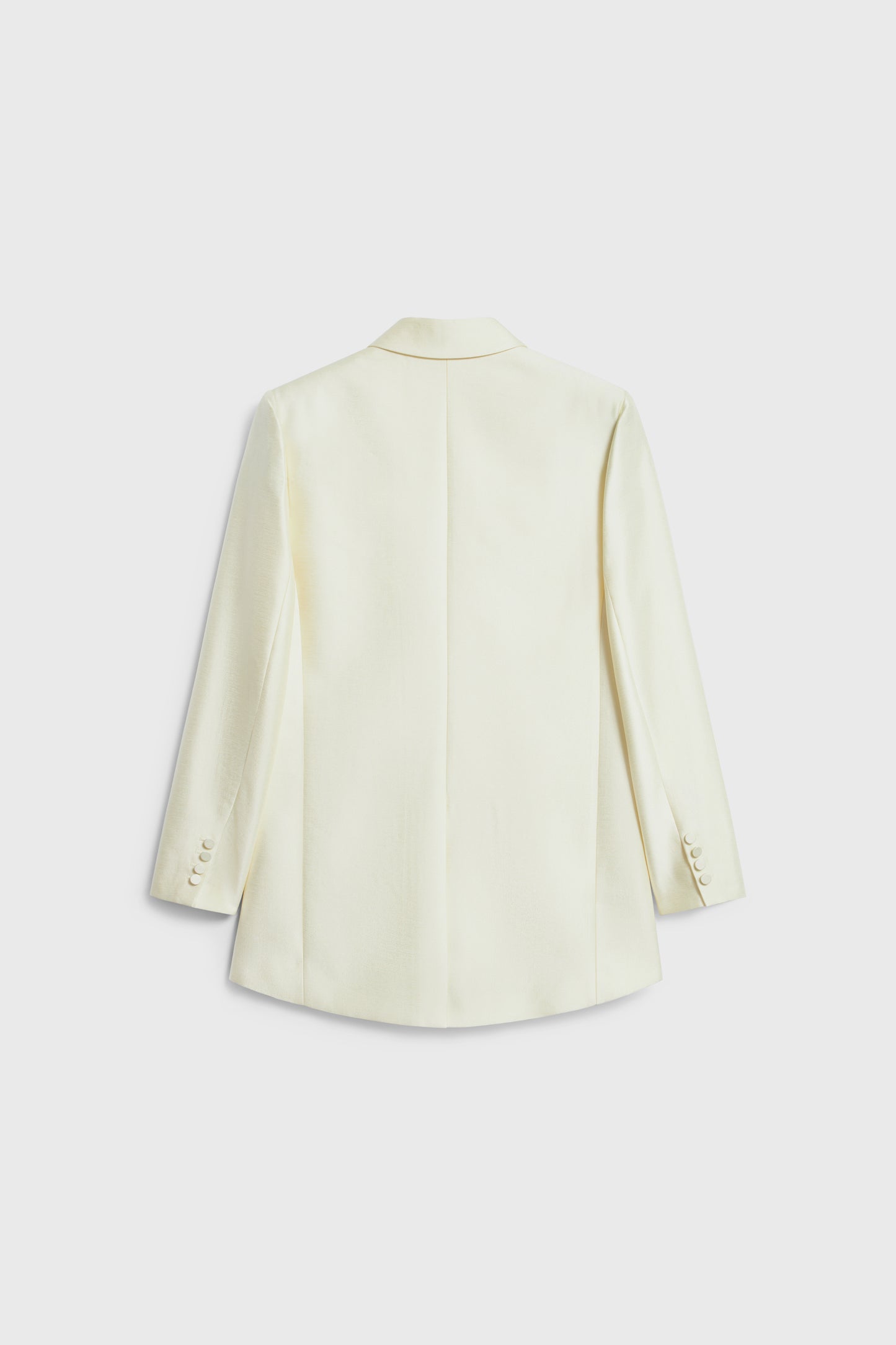 Oversized blazer made from viscose with shimmering finish. Featuring a peaked lapel collar and long sleeves, shoulder pads. Chest welt pocket and hip flap pockets. Matching lining. Single-breasted covered button fastening at the front.
