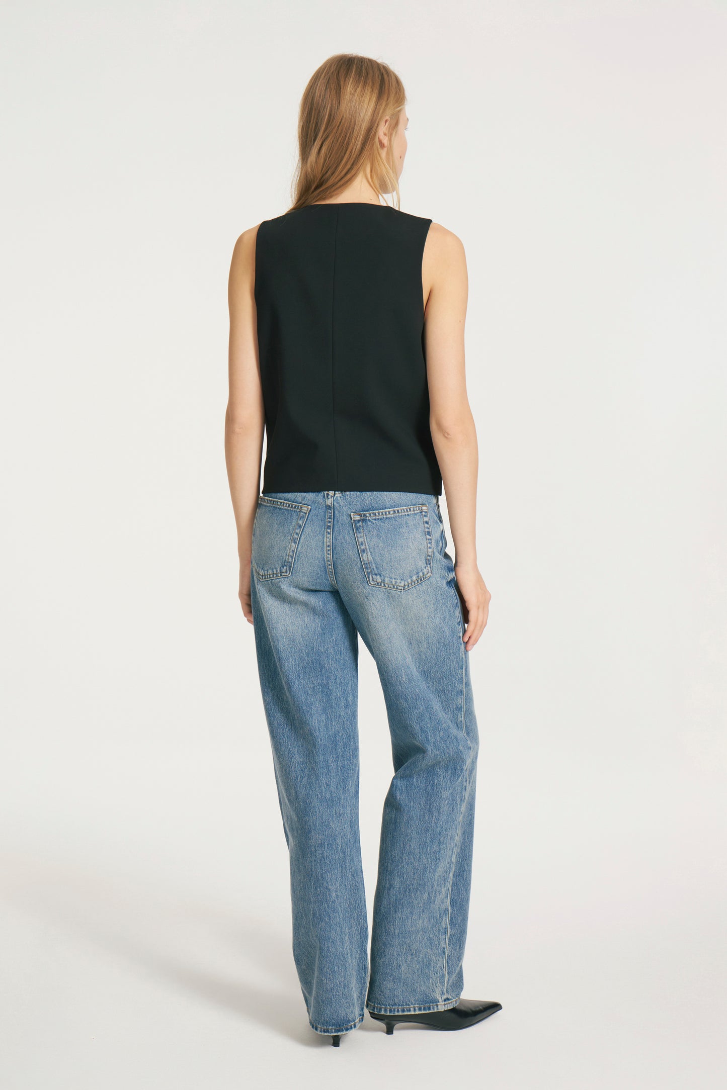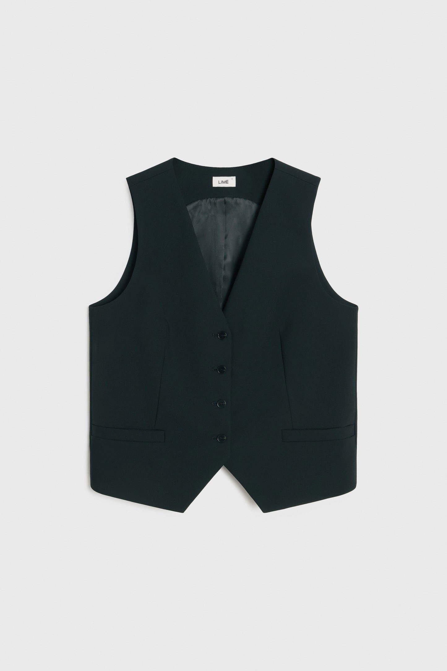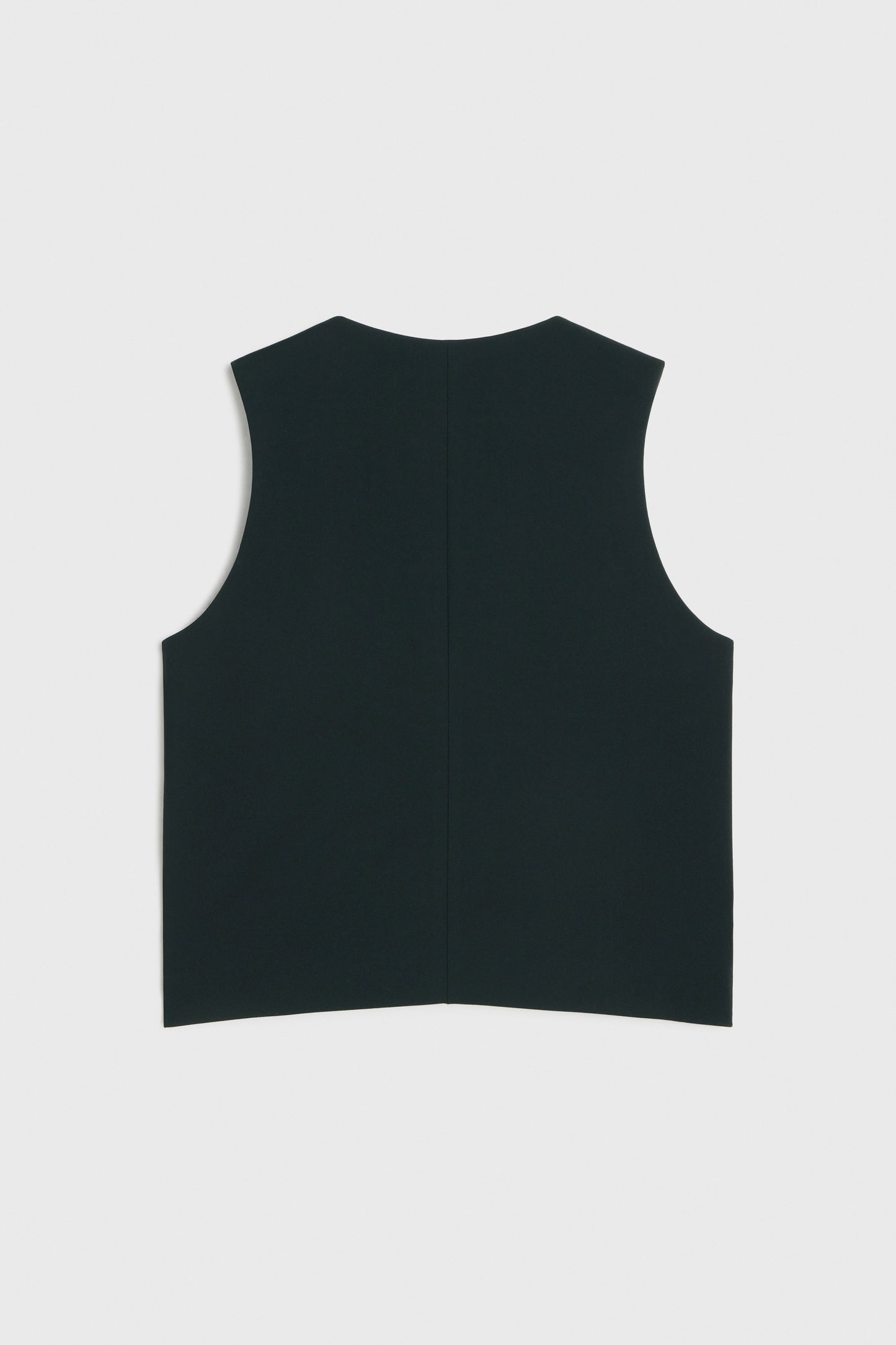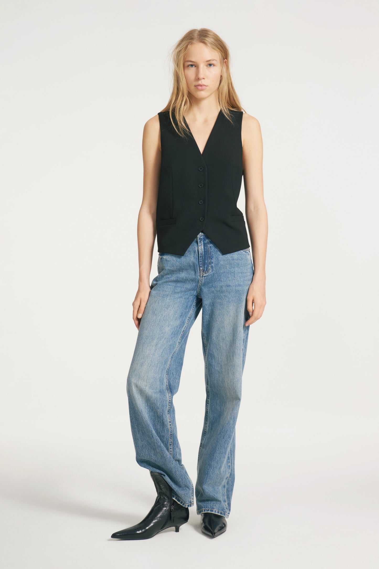 Straight fit waistcoat in woven fabric with a V-neck and fake welt pockets at the front. Pointed hems. Matching lining. Single-breasted front with buttons.
