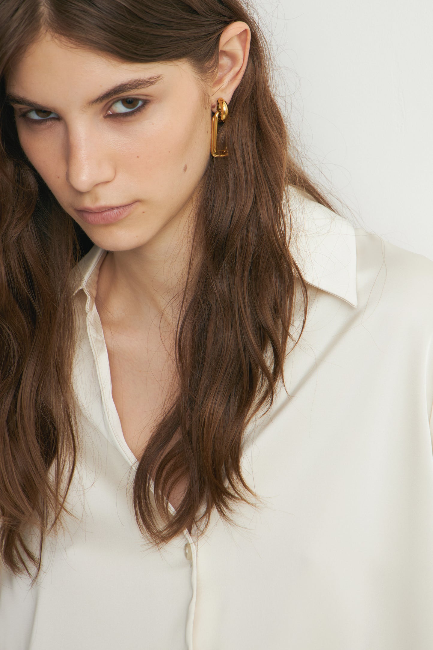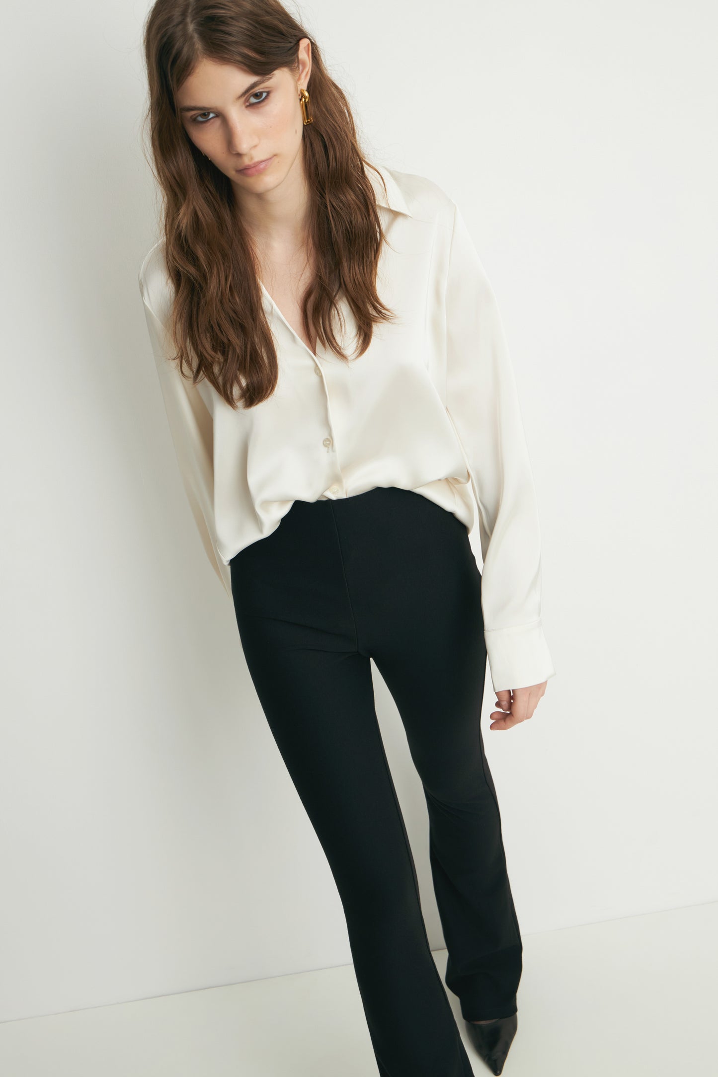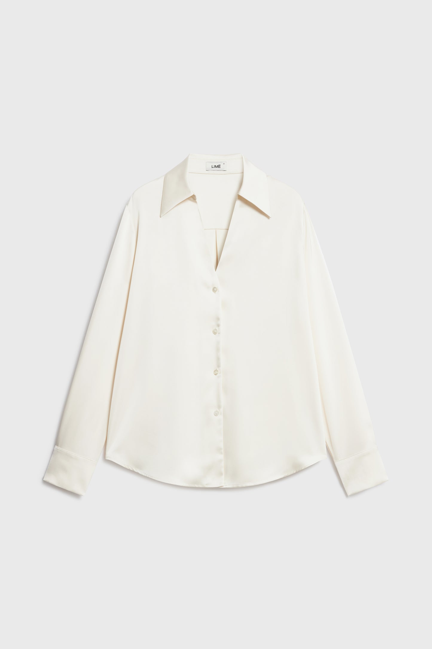 Collared shirt in satin with a V-neck and long cuffed sleeves. Rounded hem. Button-up front.