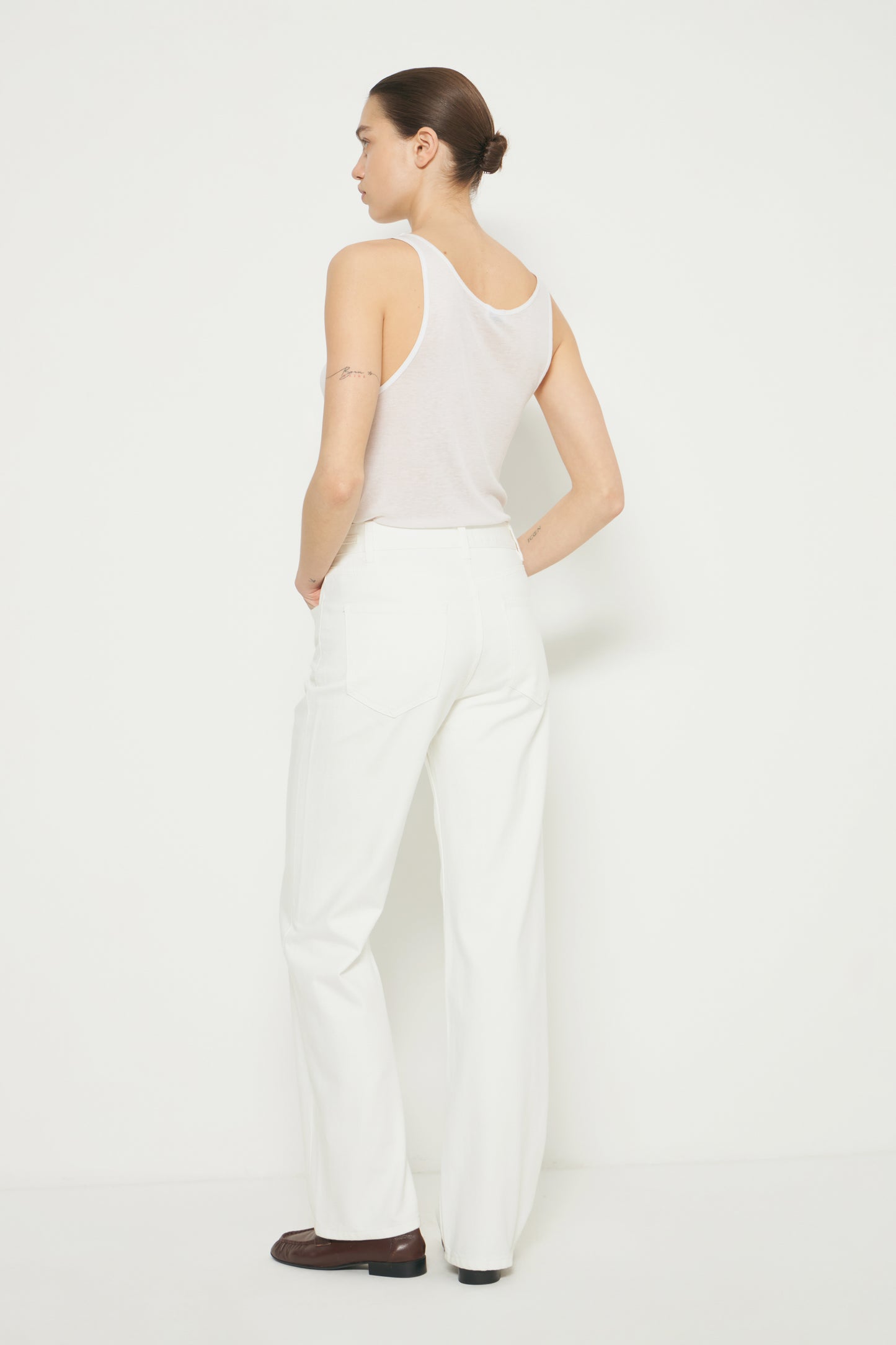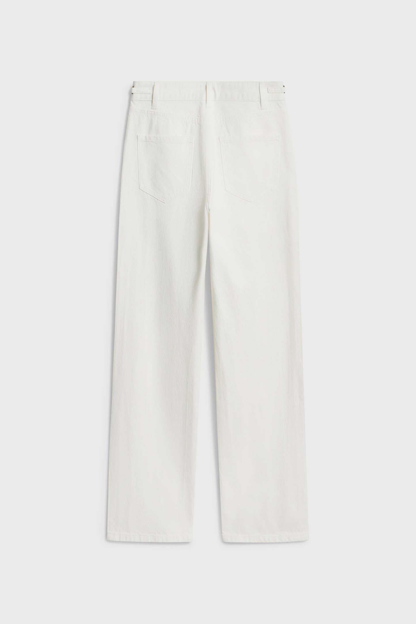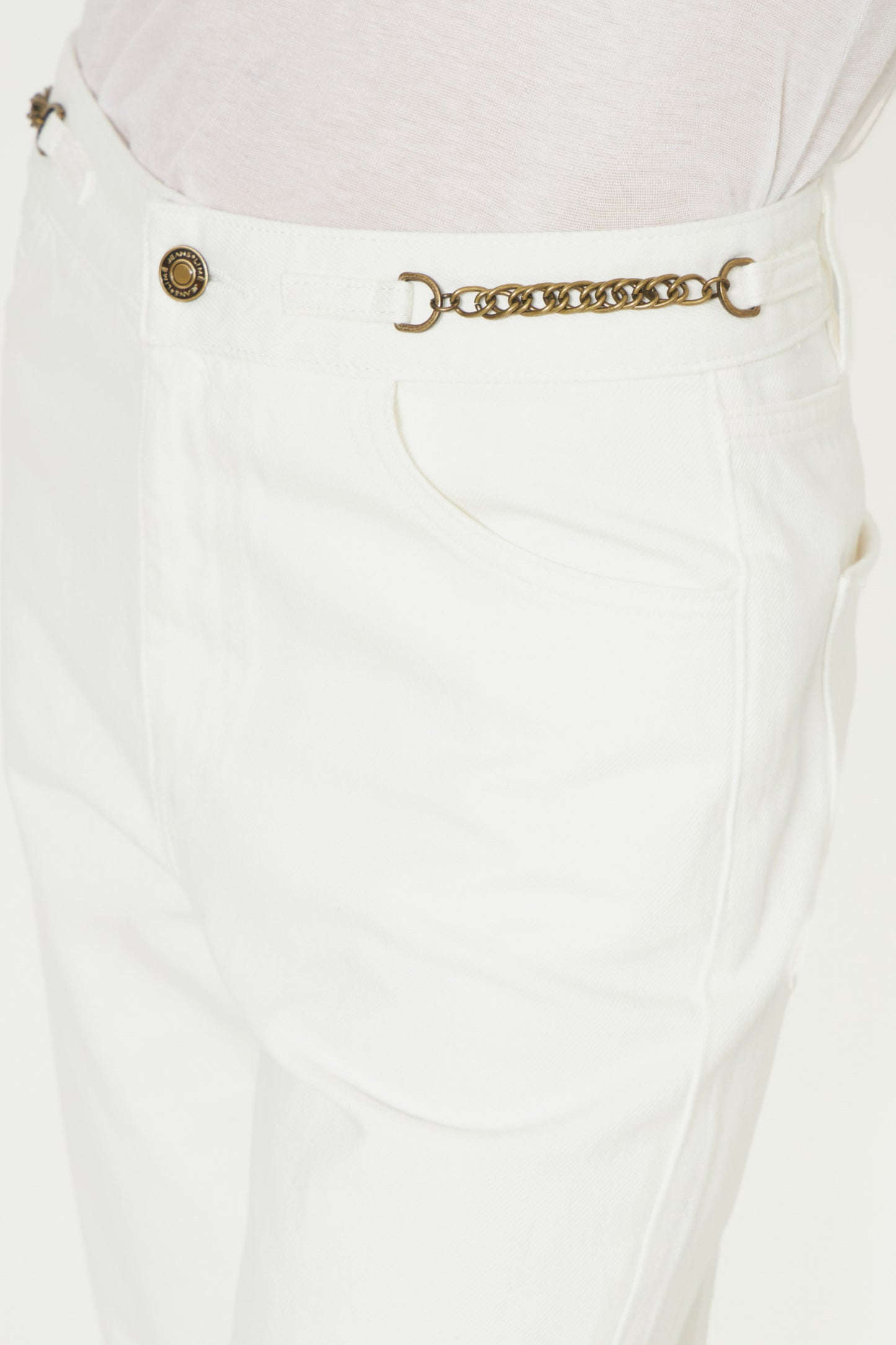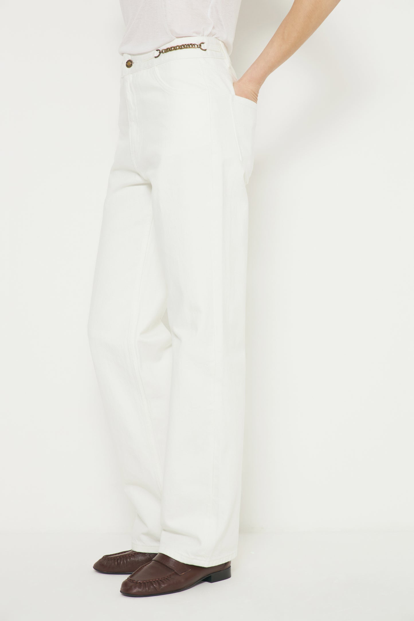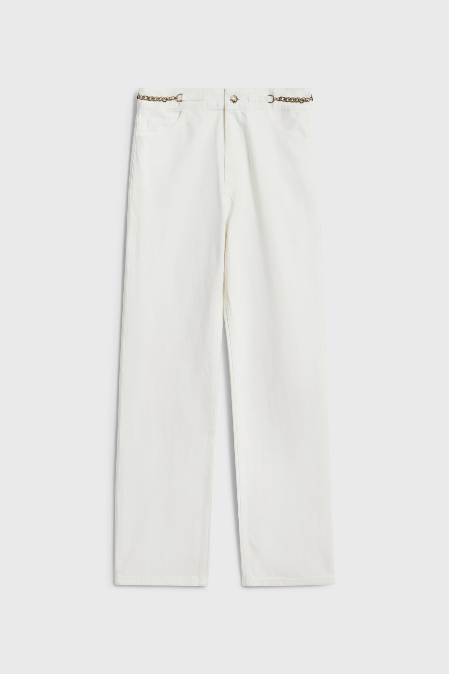 High-waist jeans with five pockets. Straight-leg design. Styled with metal chains on the waistband. Front zip fly and top button fastening.