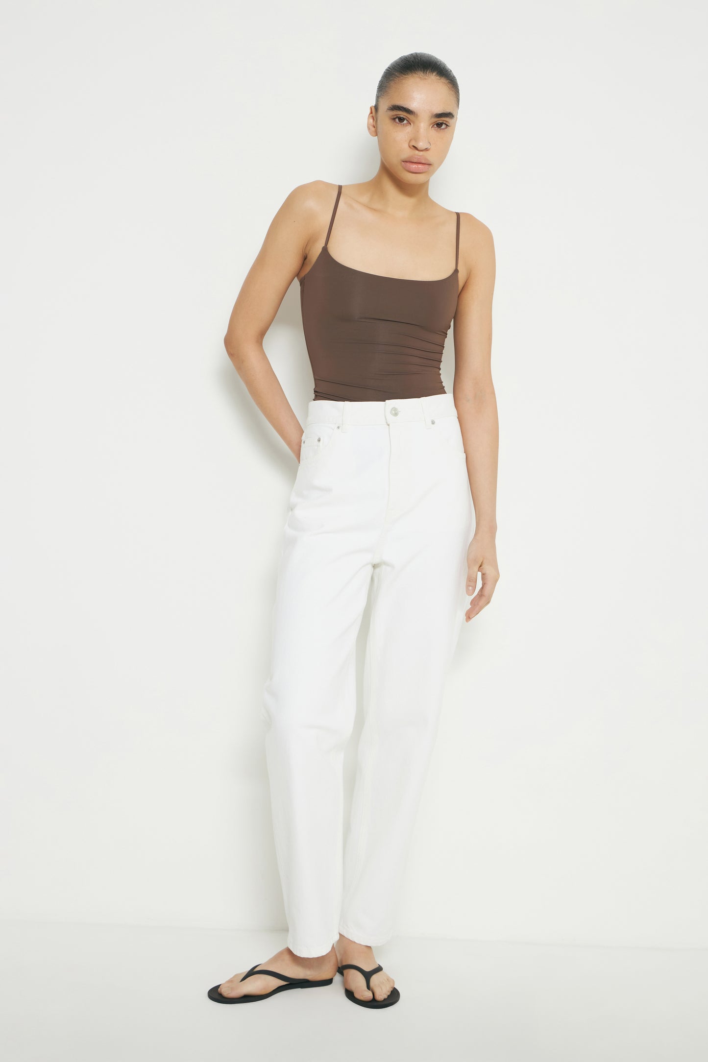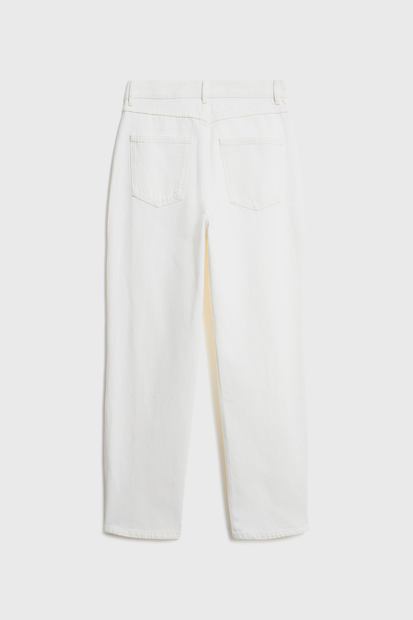 High-waist jeans with five pockets. Straight-leg design. Front zip fly and top button fastening.