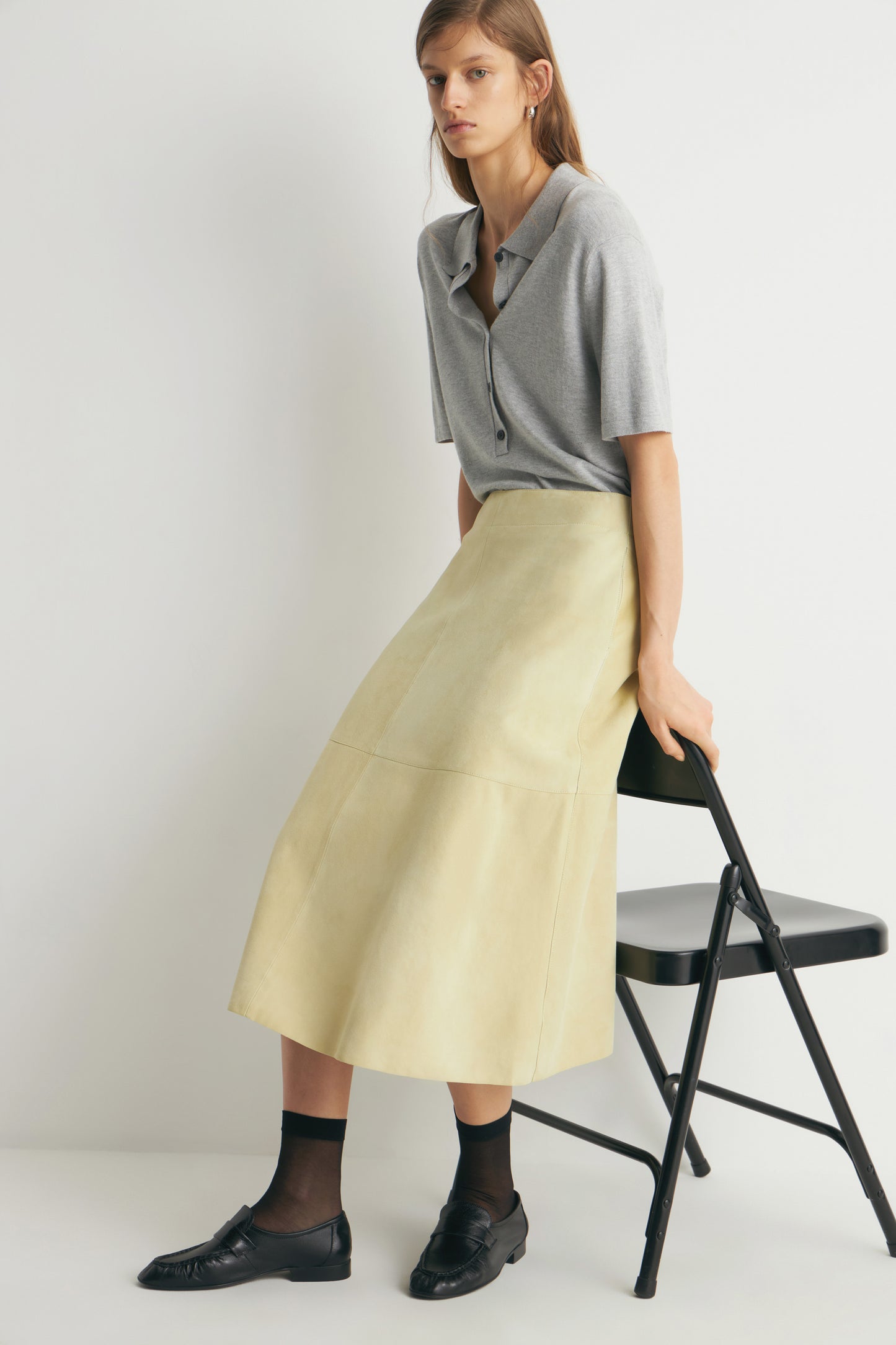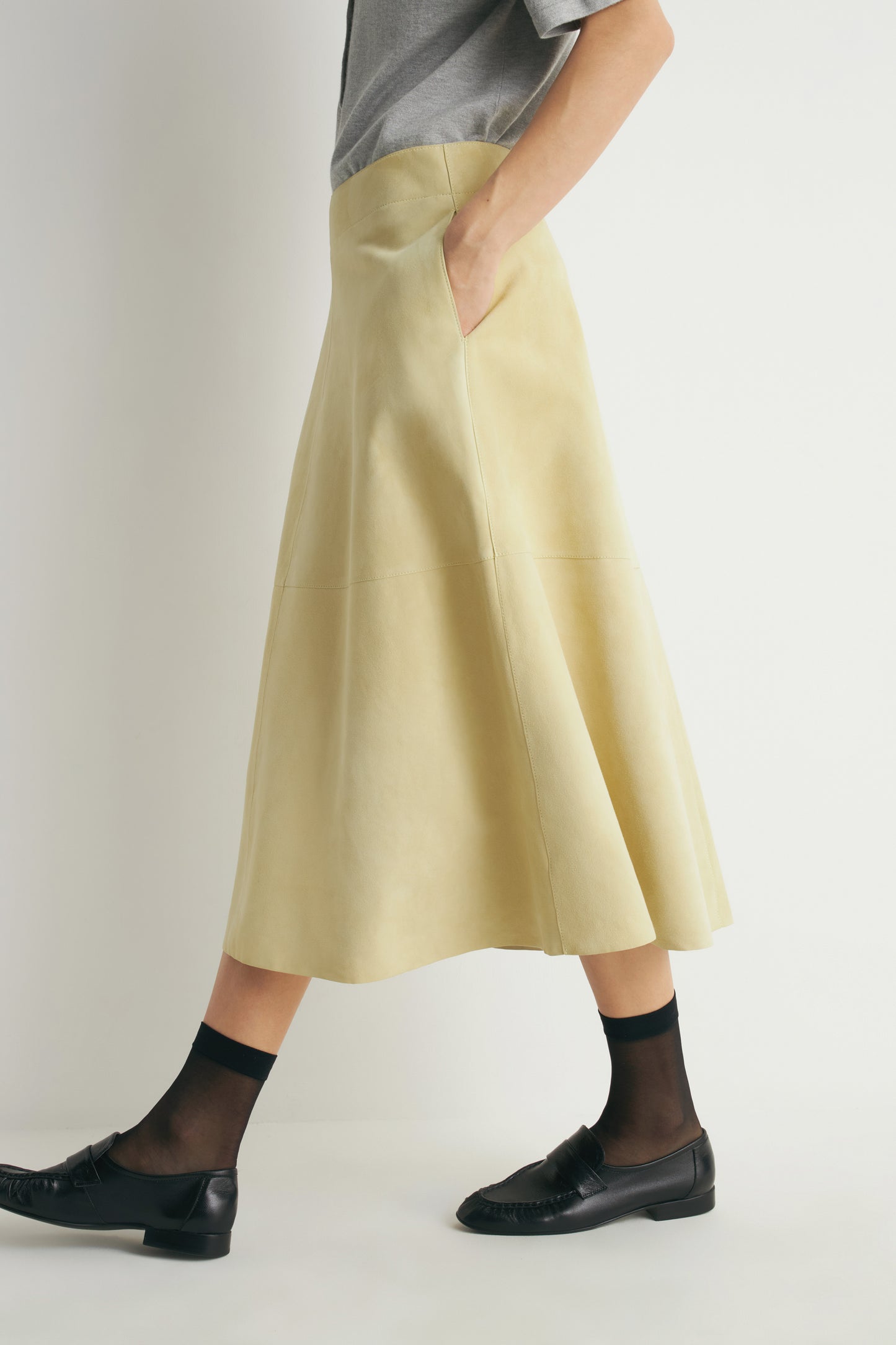 Flared skirt in soft suede with front pockets and visible seams. Lined. Back zip fastening.