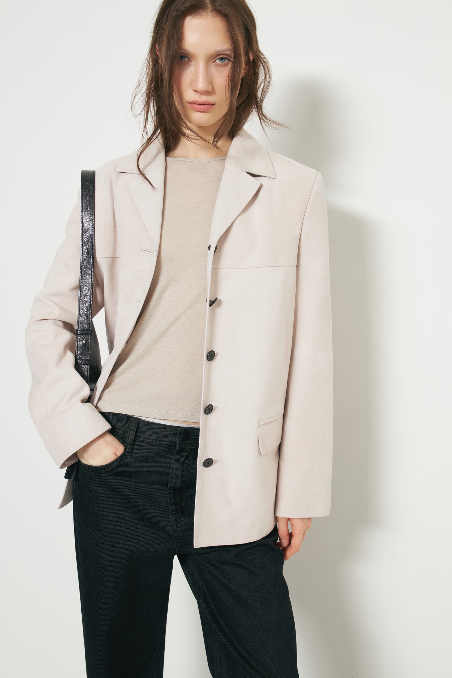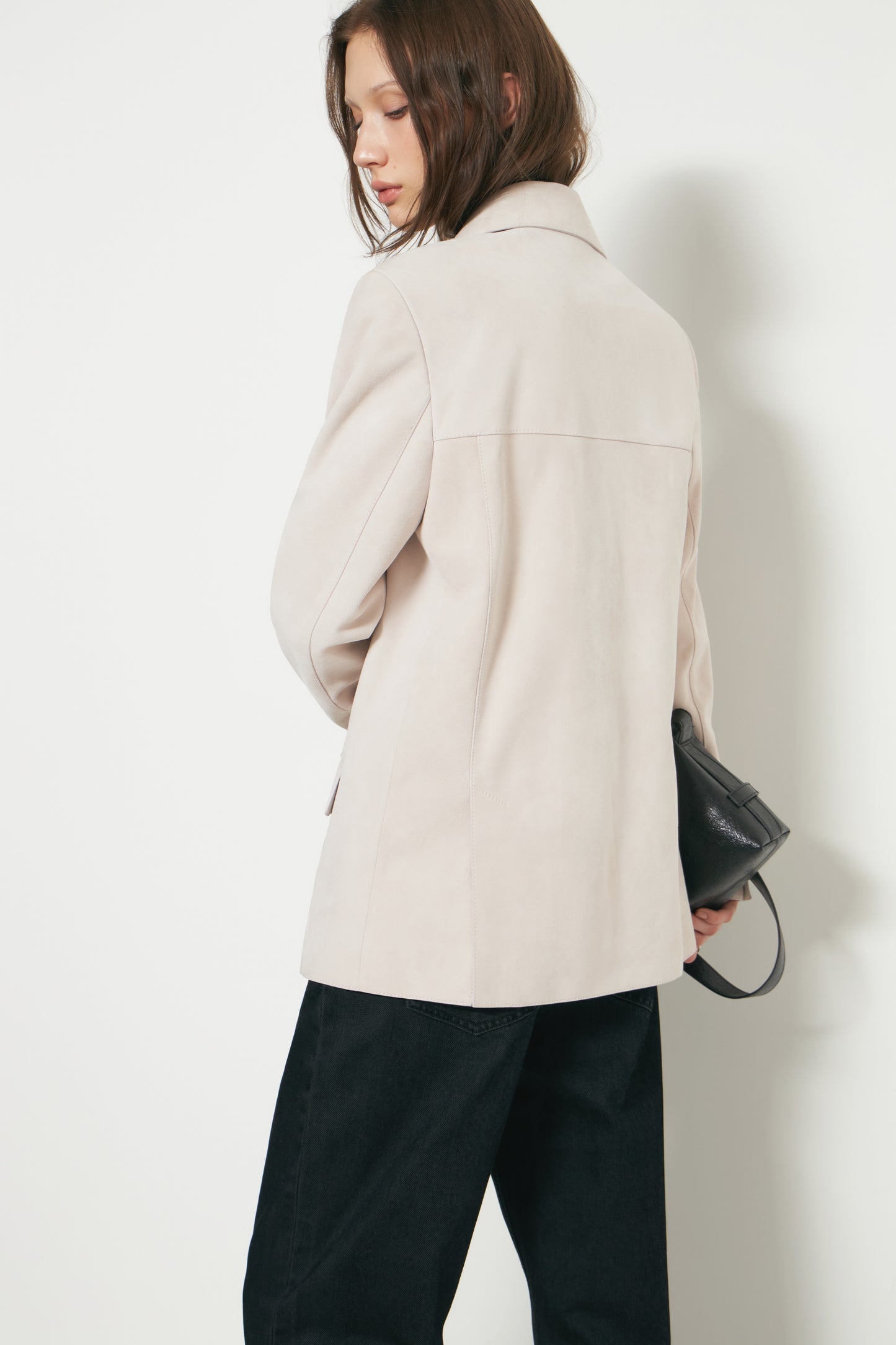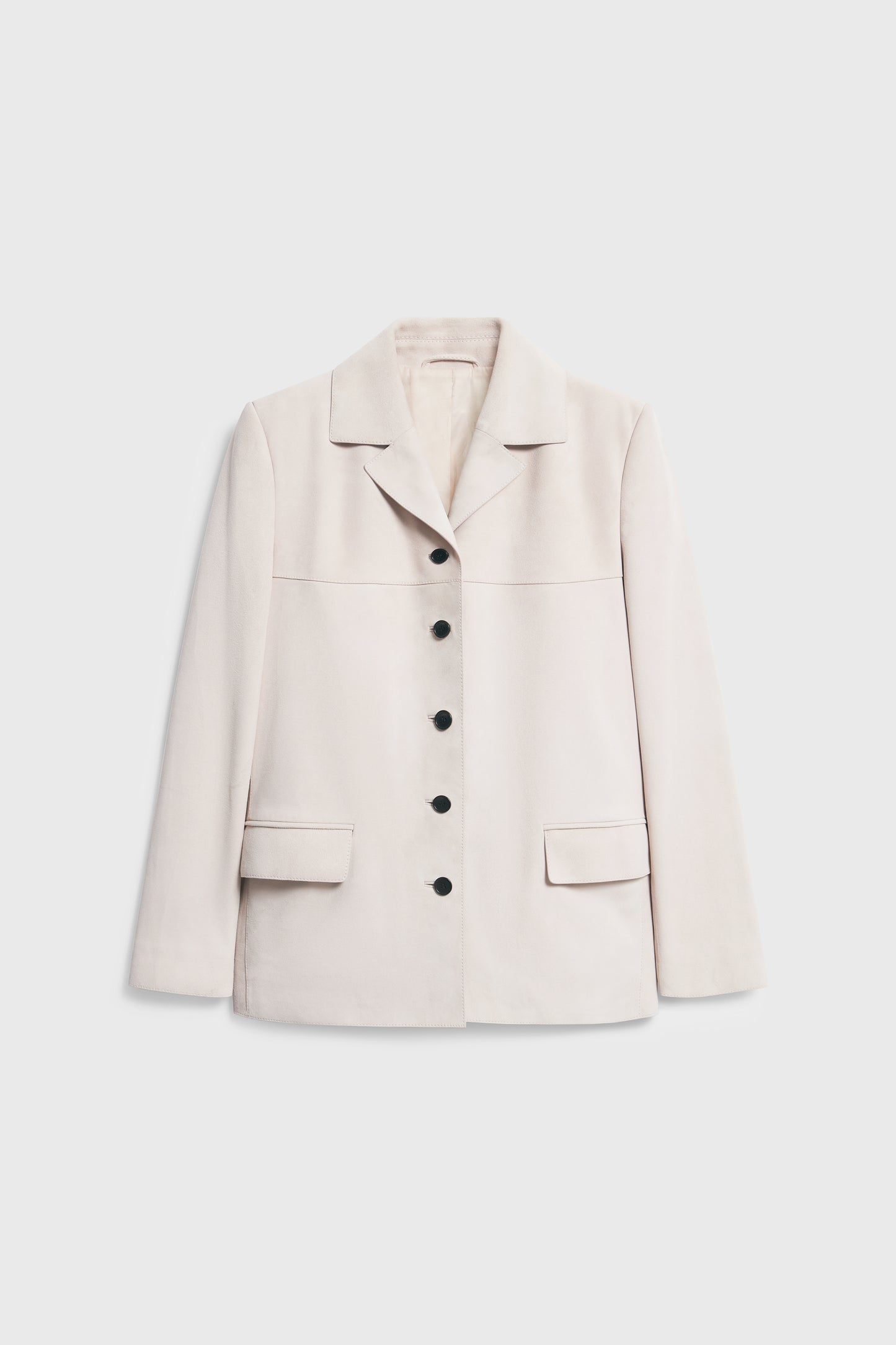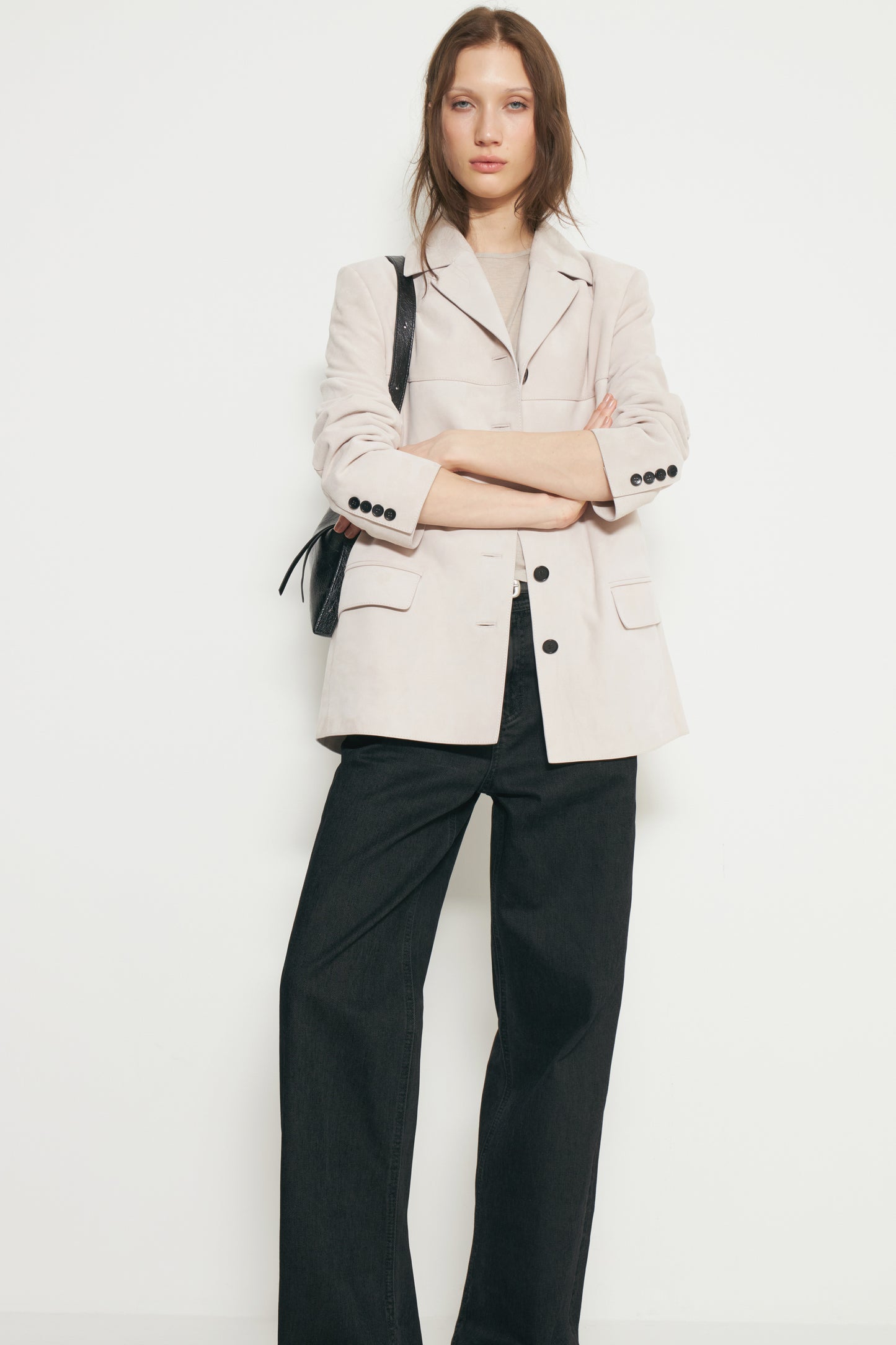 Oversized blazer is crafted from softly brushed suede. Featuring notched lapel collar and long sleeves with buttoned cuffs, shoulder pads. Front hip flap pockets. Matching lining. Single-breasted front with buttons.