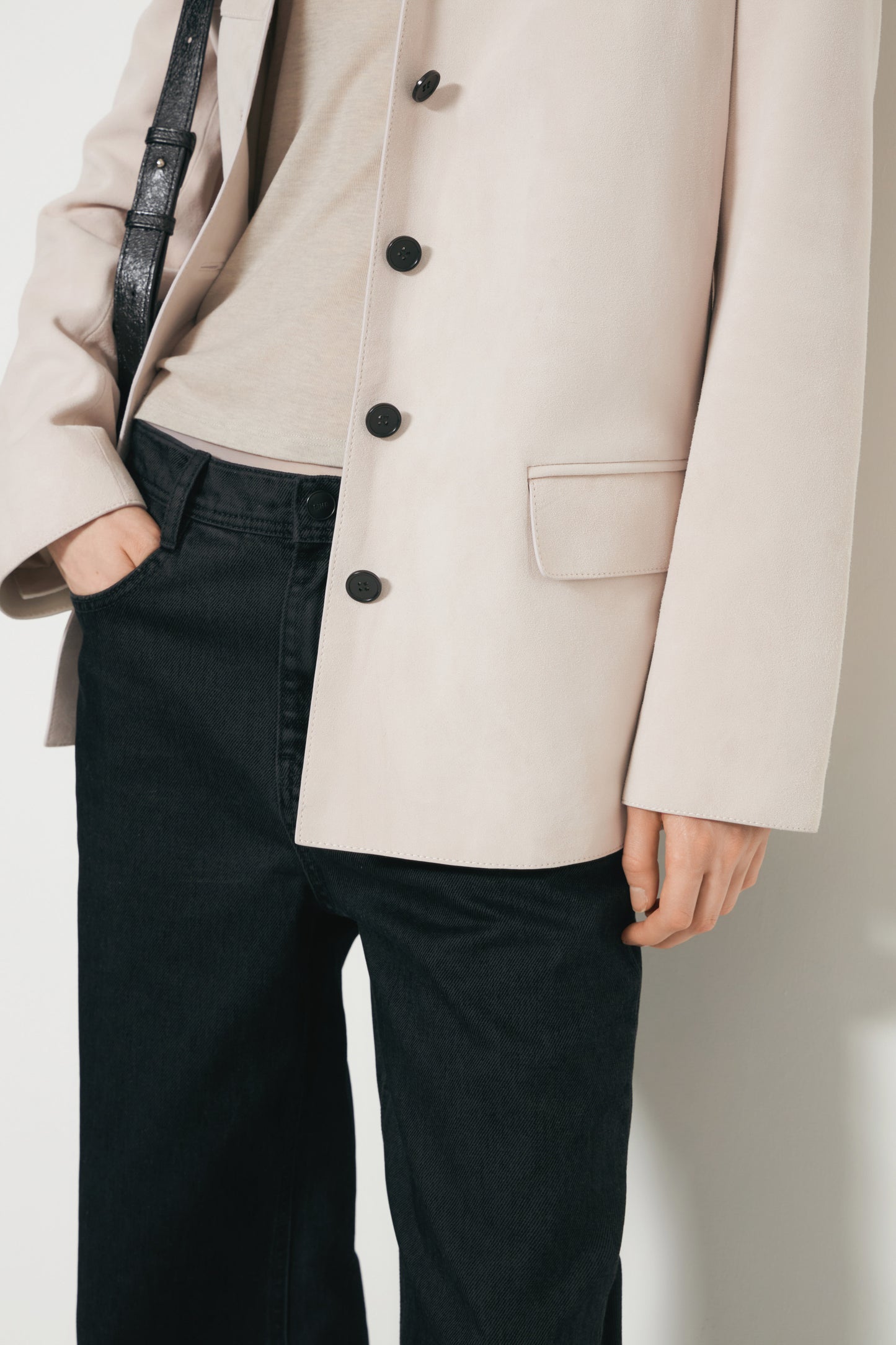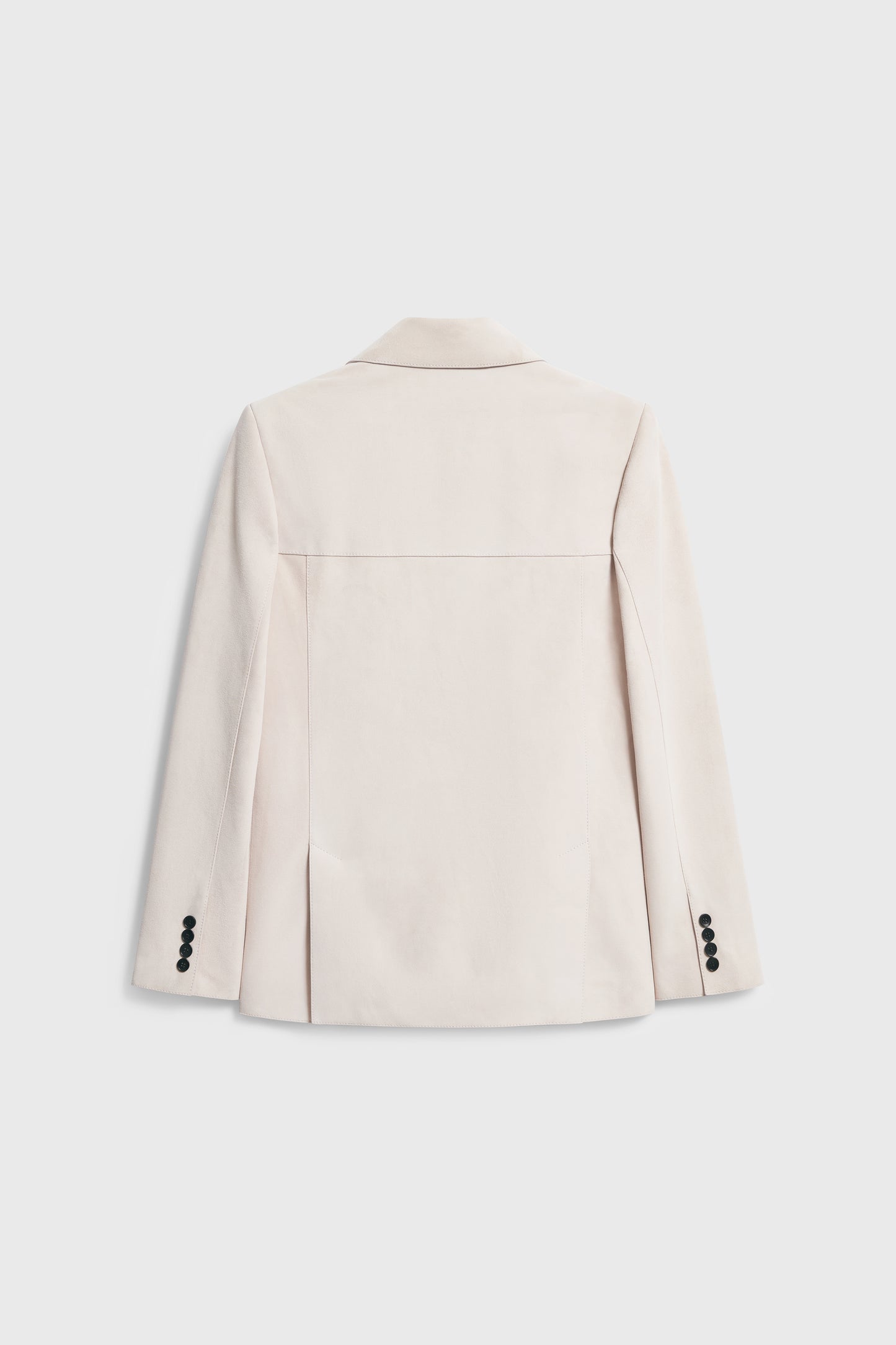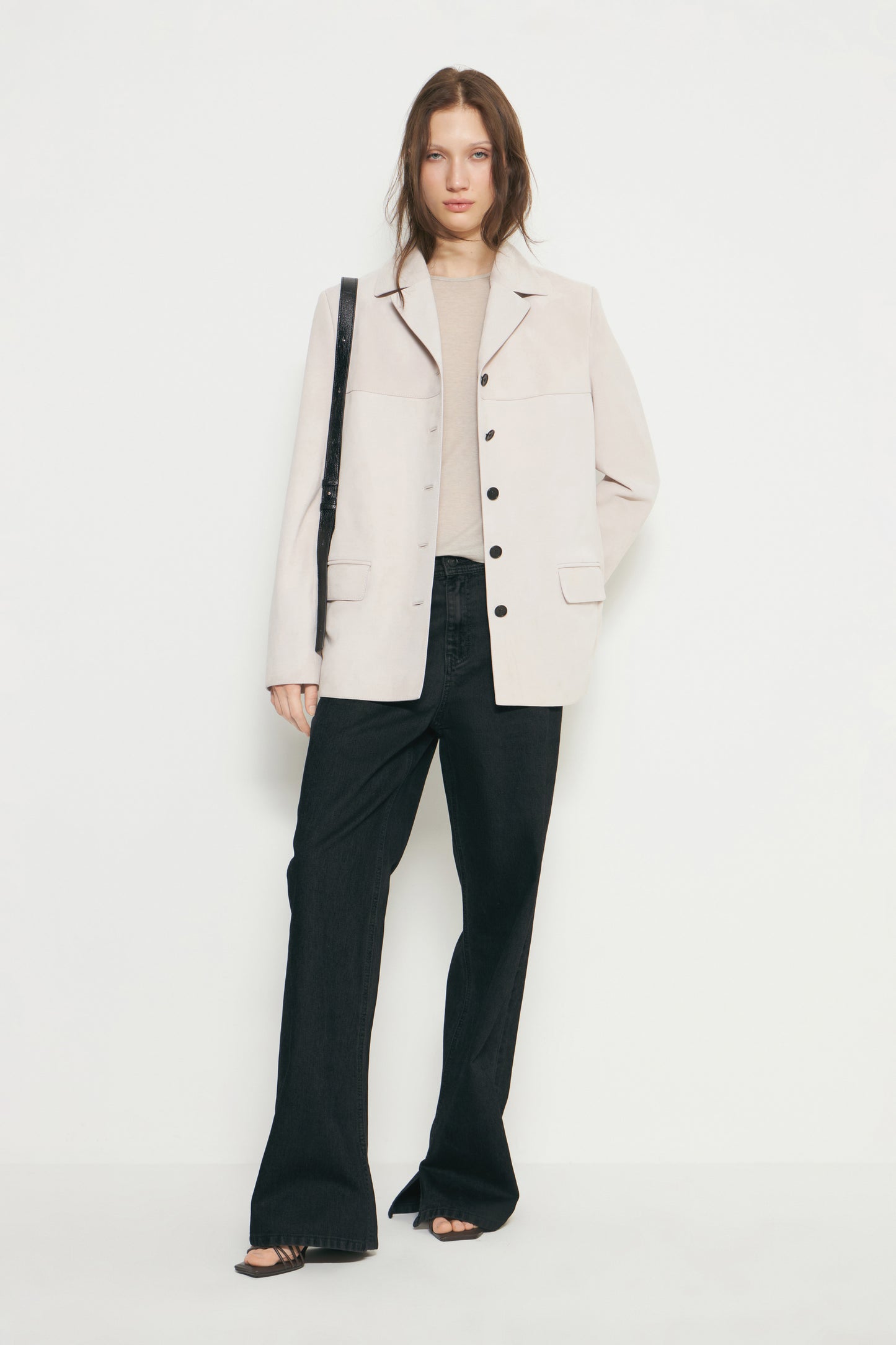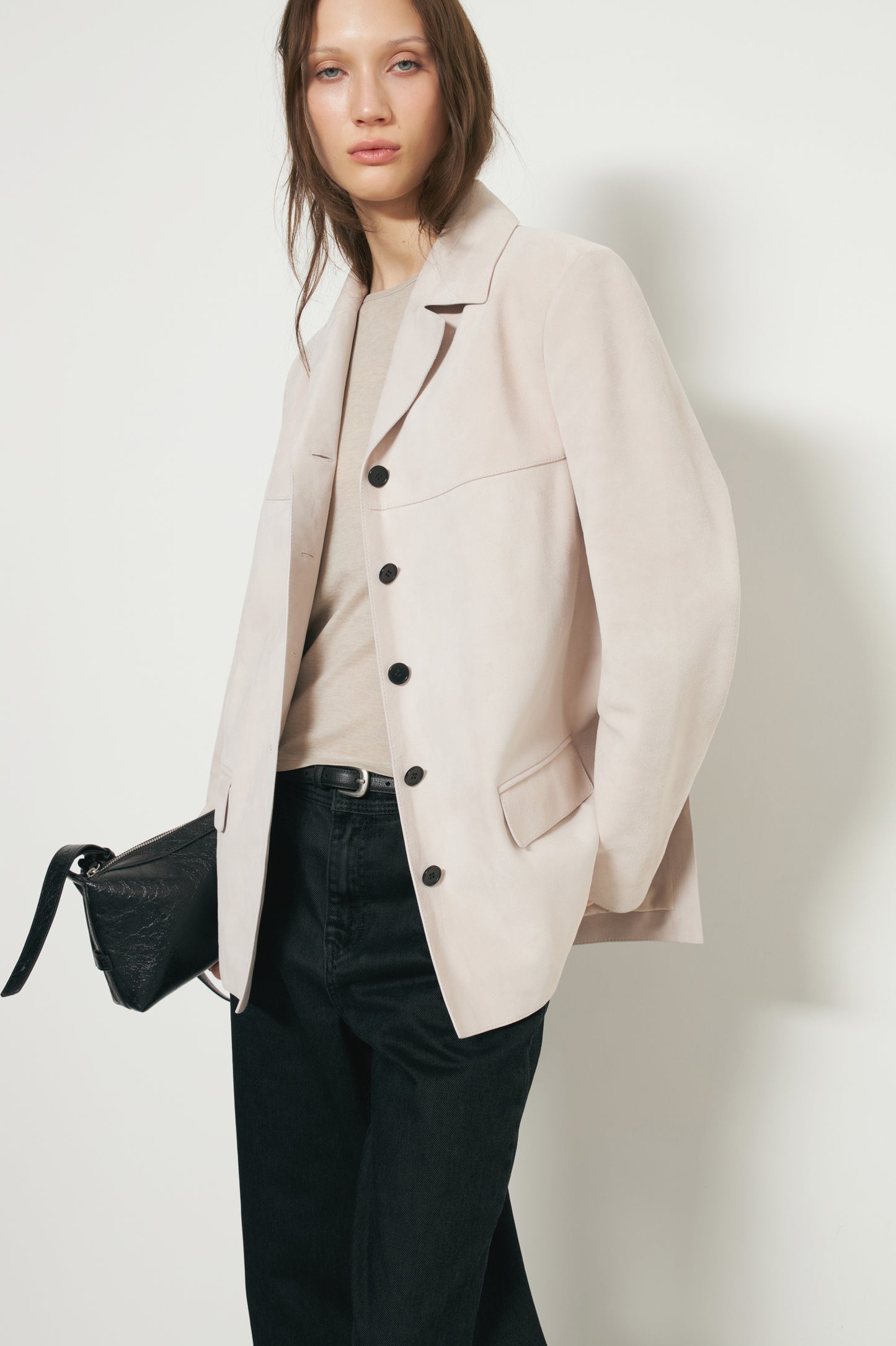 Oversized blazer is crafted from softly brushed suede. Featuring notched lapel collar and long sleeves with buttoned cuffs, shoulder pads. Front hip flap pockets. Matching lining. Single-breasted front with buttons.