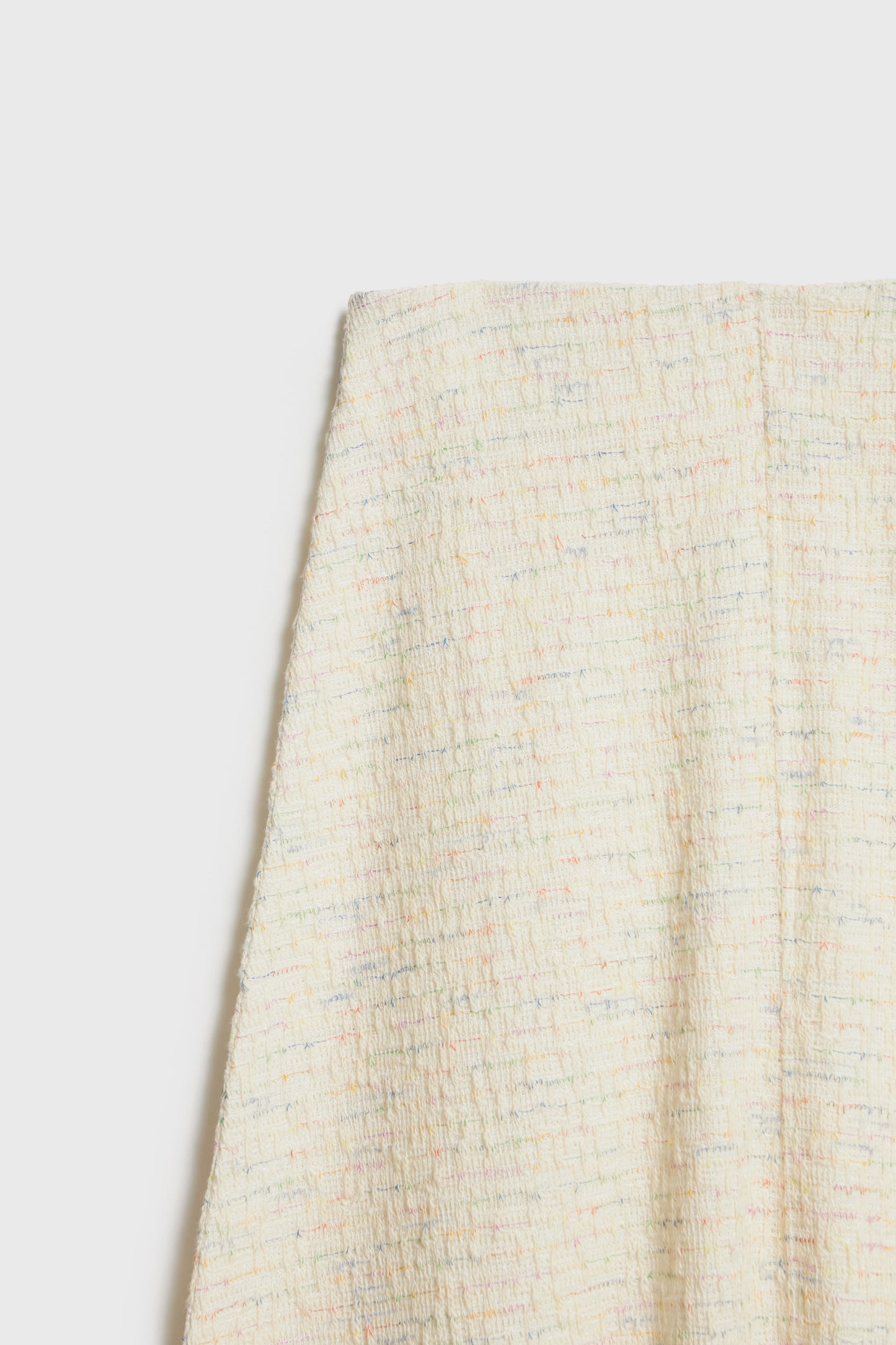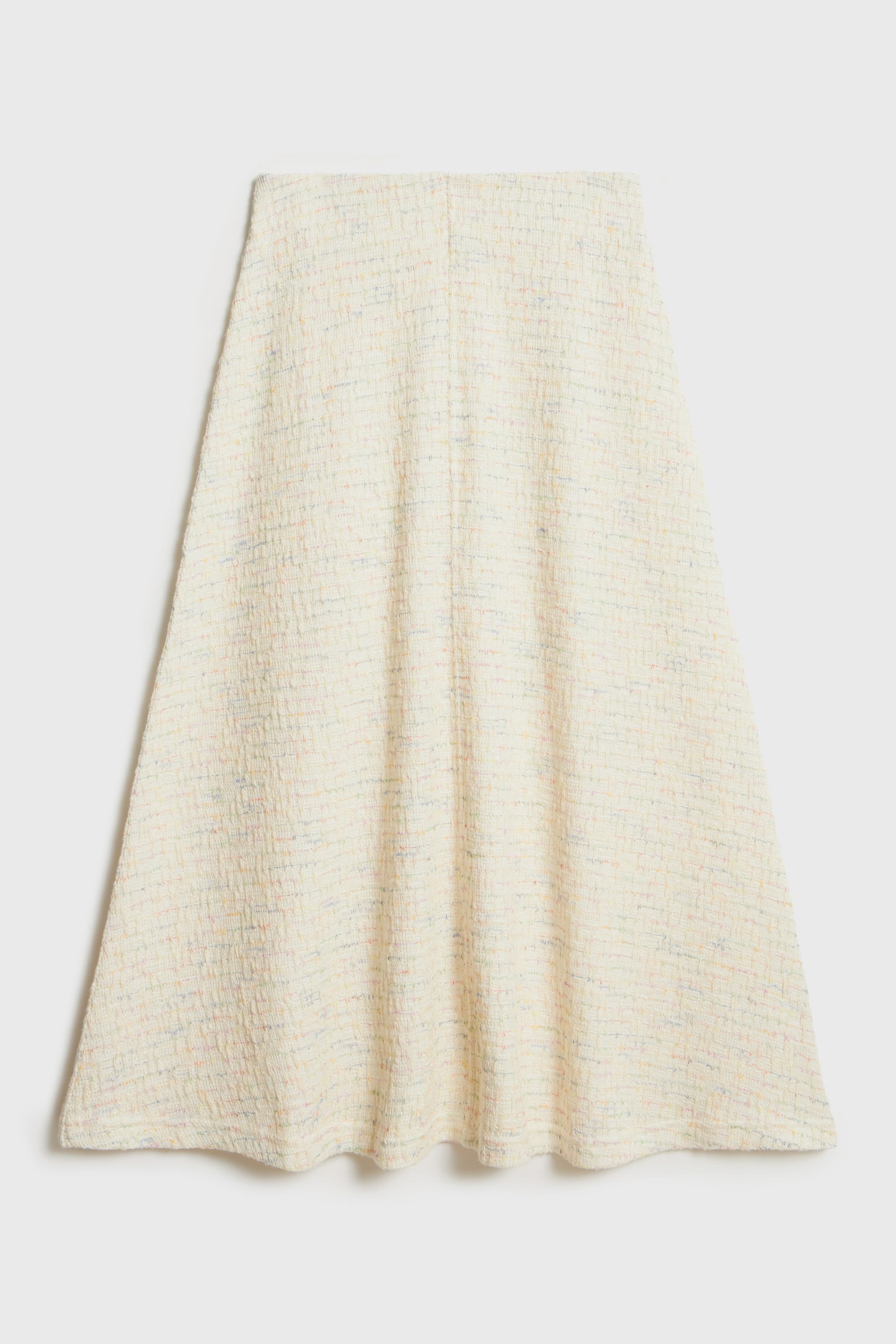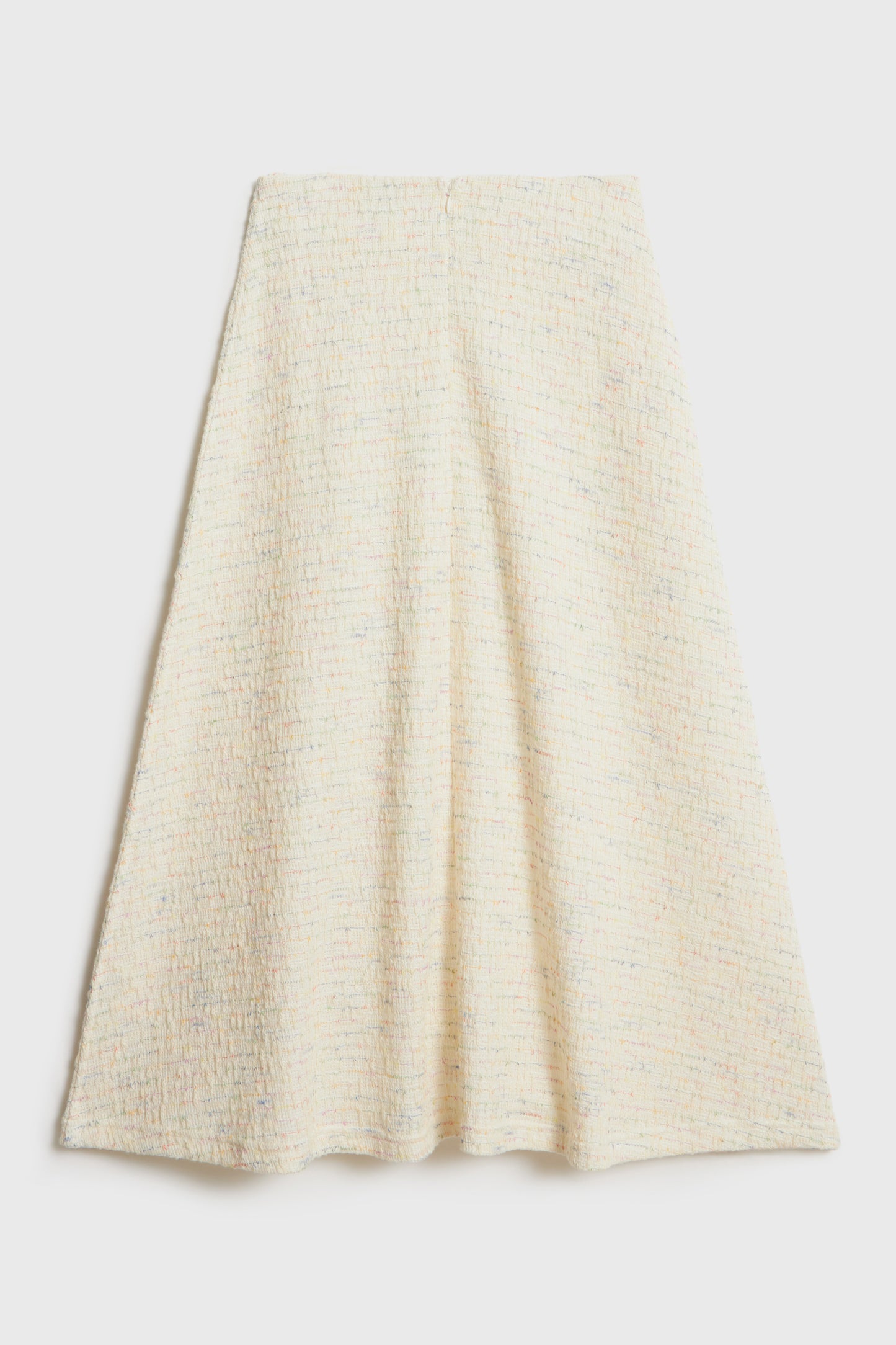 Flared, midi skirt in woven, textured fabric. A concealed zipper at one side with button fastener.