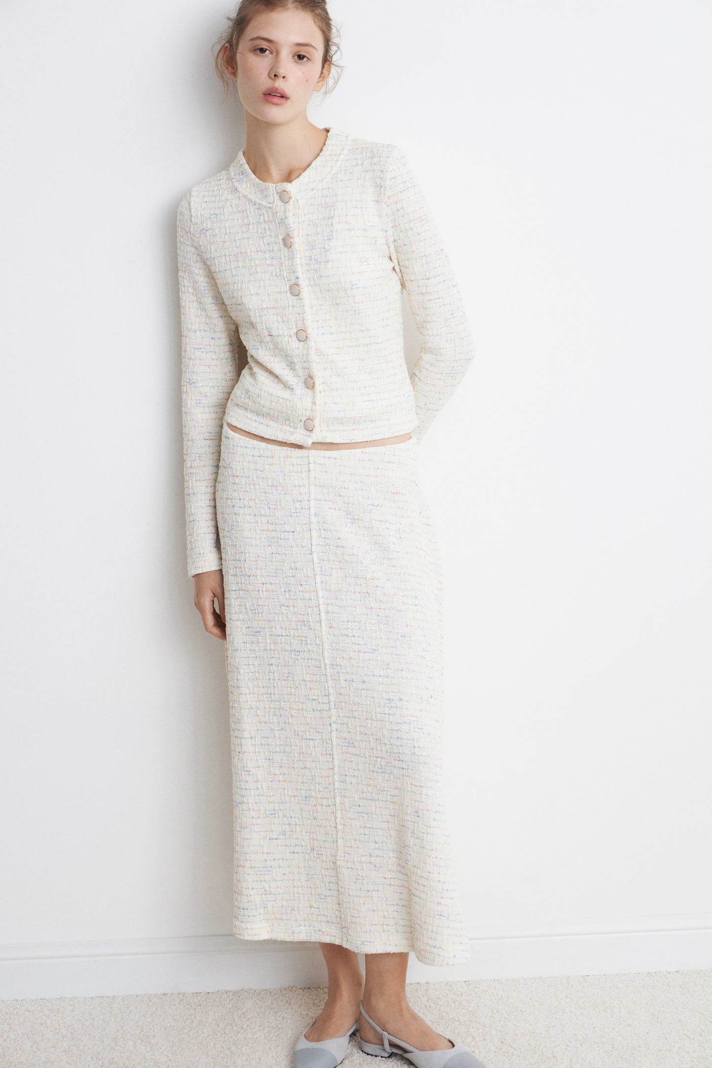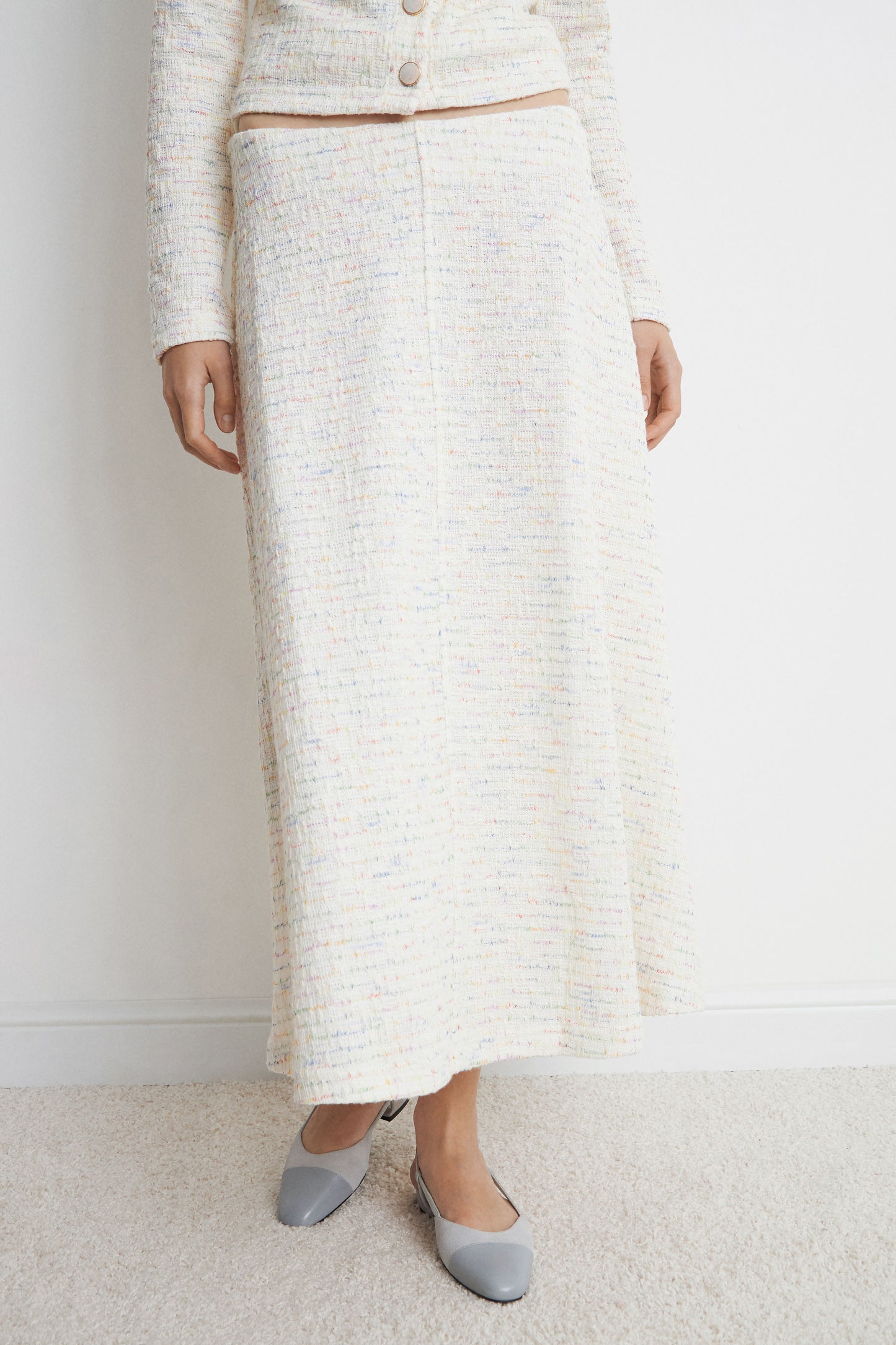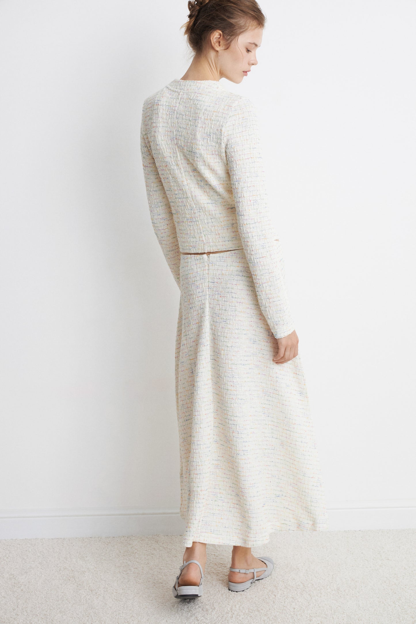 Flared, midi skirt in woven, textured fabric. A concealed zipper at one side with button fastener.