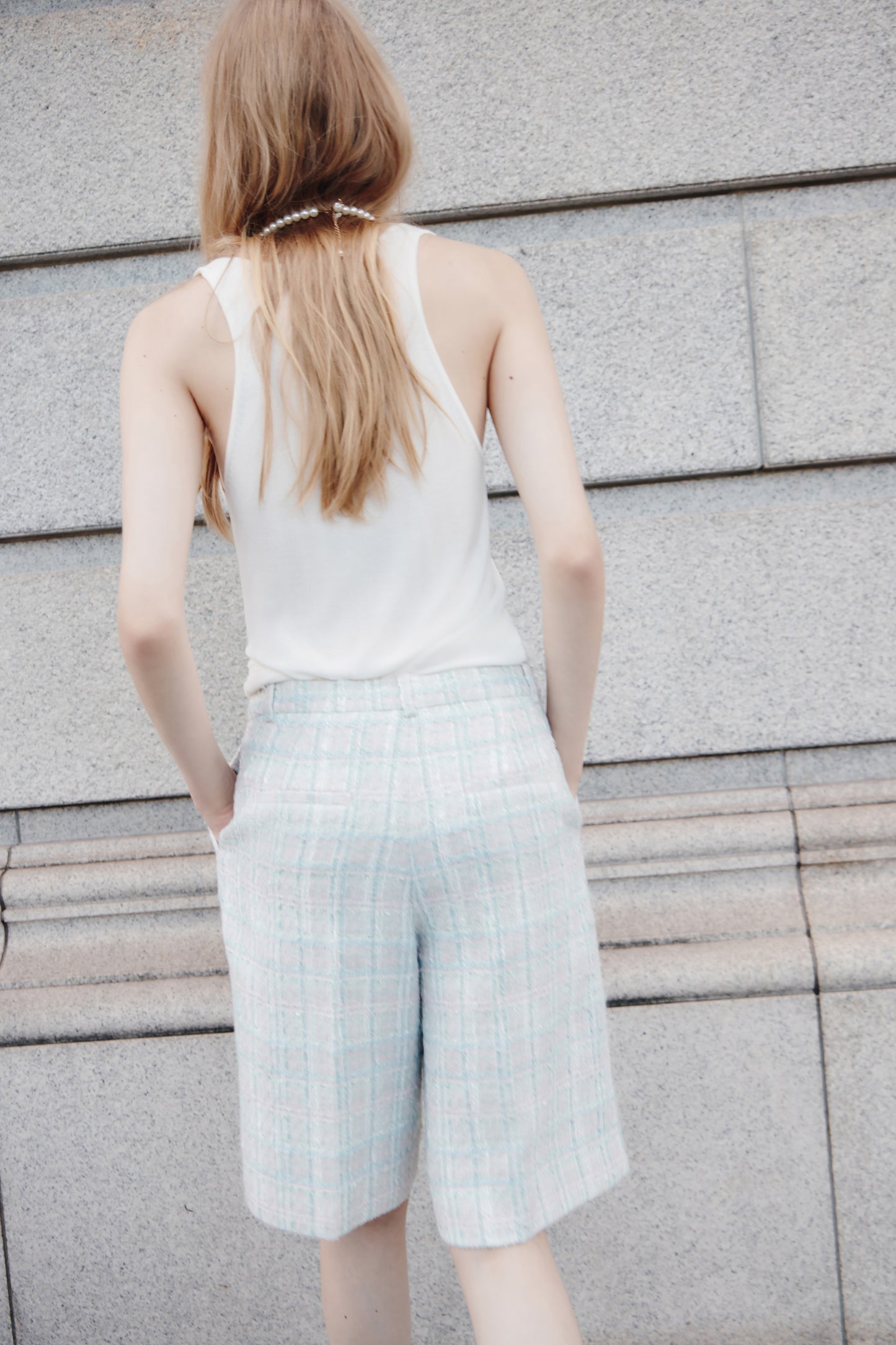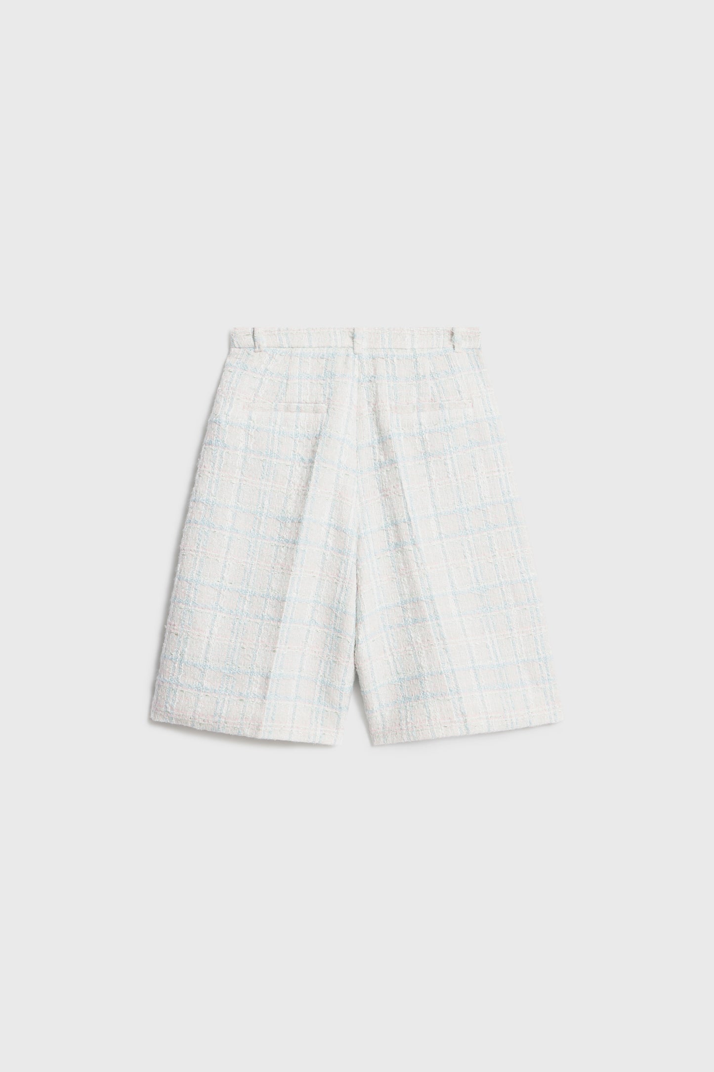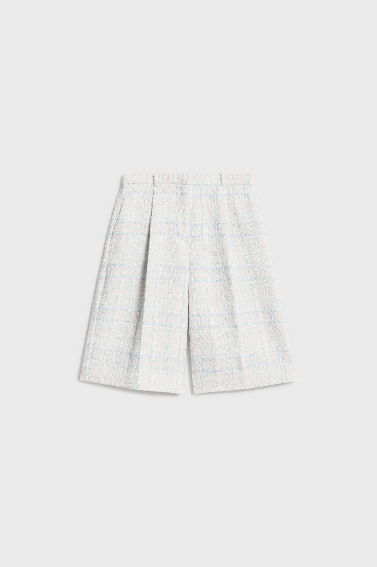 Long straight fit shorts in woven, textured fabric. Dart details on the front. Front side pockets and back welt pockets. Front zip fly, interior button and metal hook fastening. Lined.