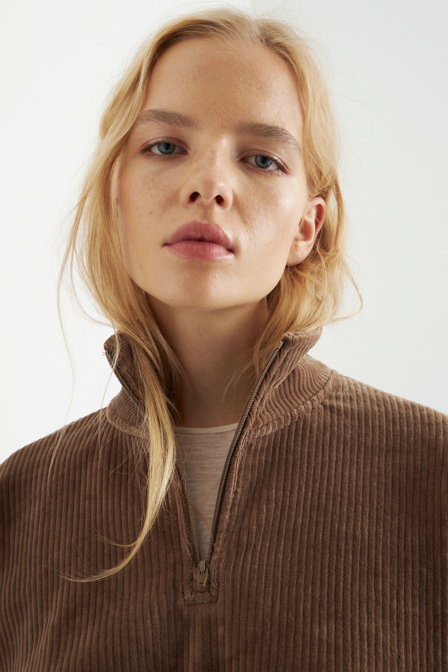 Oversize fit top made of textured cotton blend fabric. Featuring long sleeves with cuff. High neck with front zip closure. Ribbed trim.