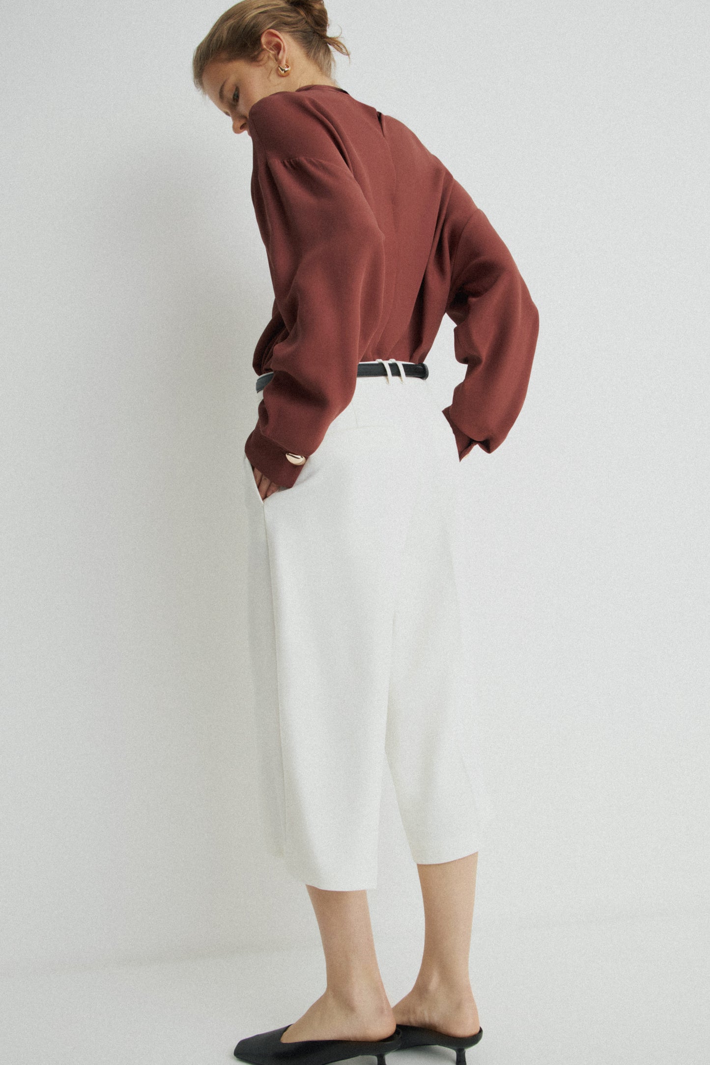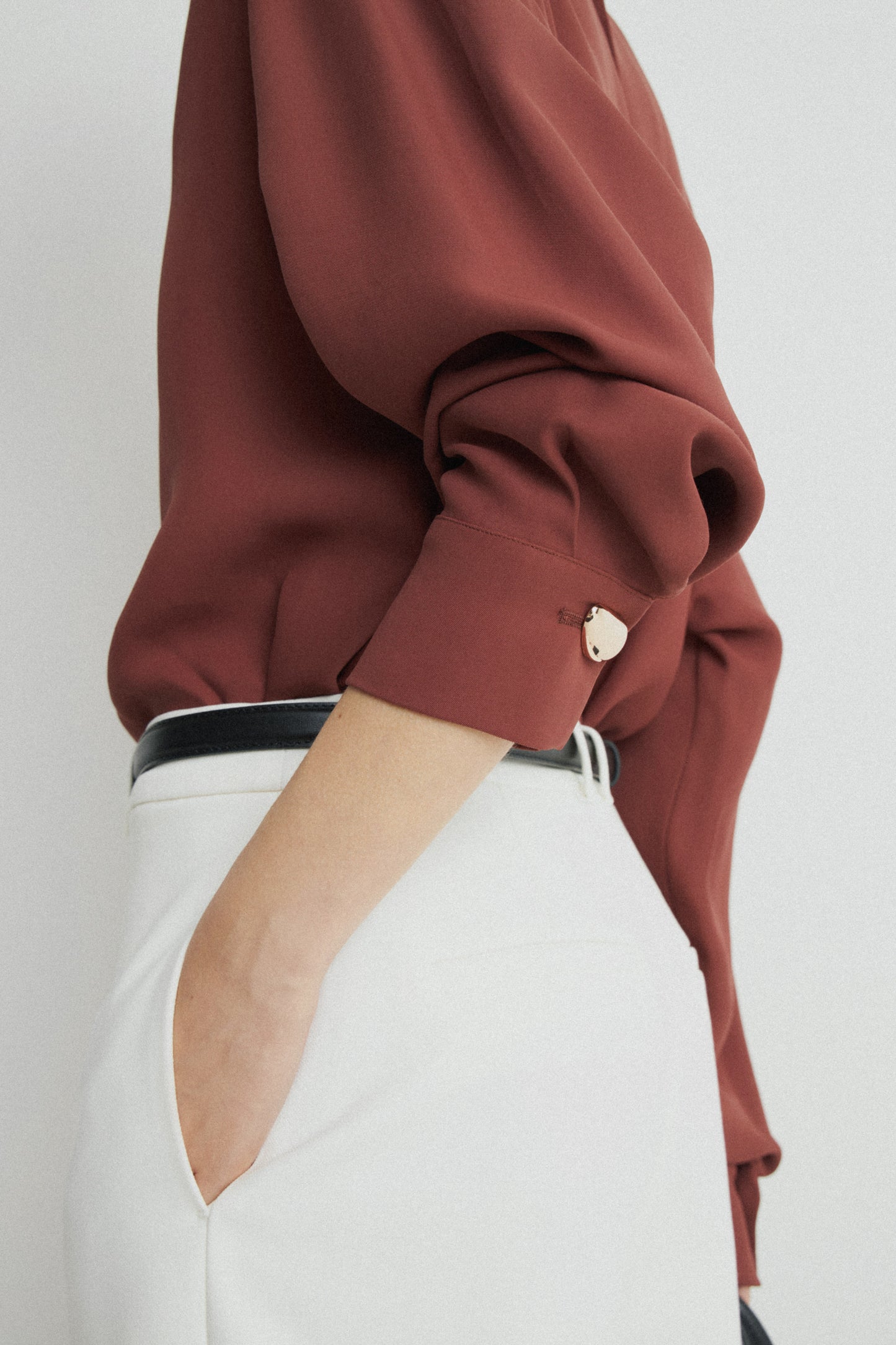 Loose-fit blouse in viscose and lyocell blend is enriched by decorative metal buttons. High neck and long sleeves with cuffs.