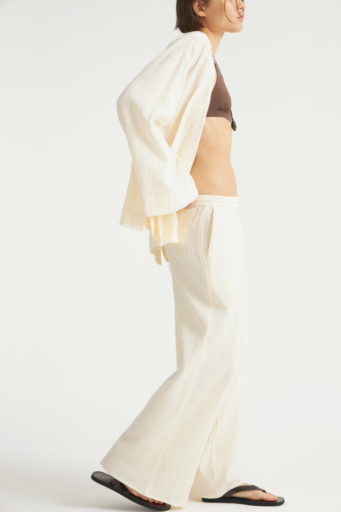 Wide, relaxed-fit trousers in soft cotton muslin that featuring wide legs and a low, elasticated waist with a narrow drawstring. Front pockets and fake back pockets.