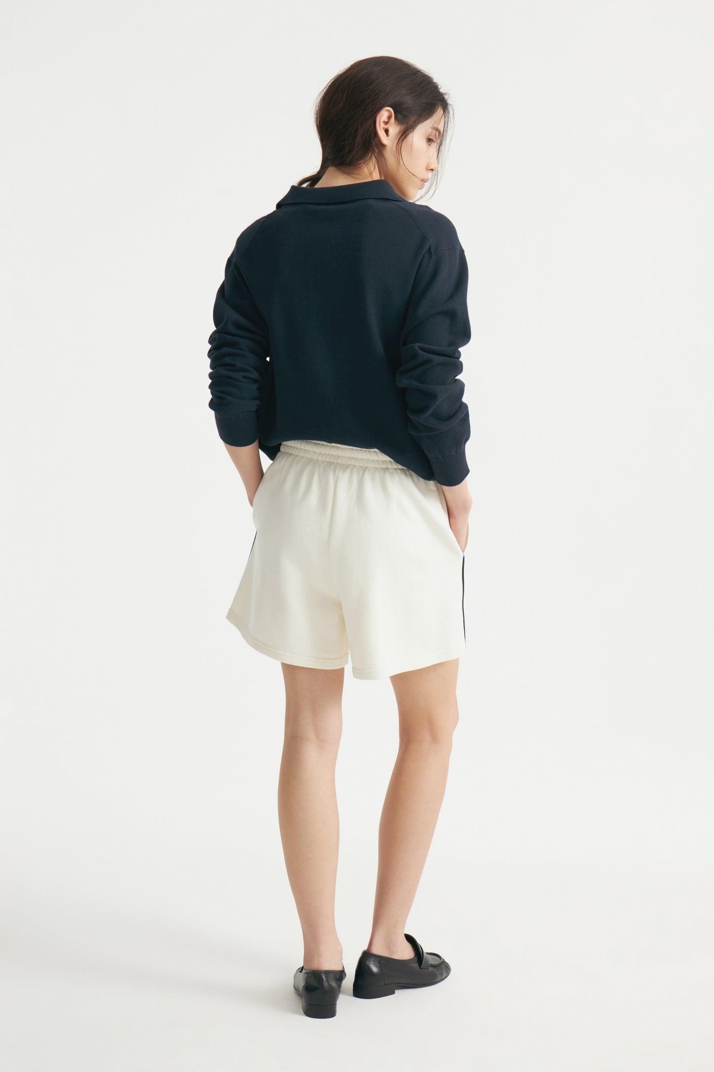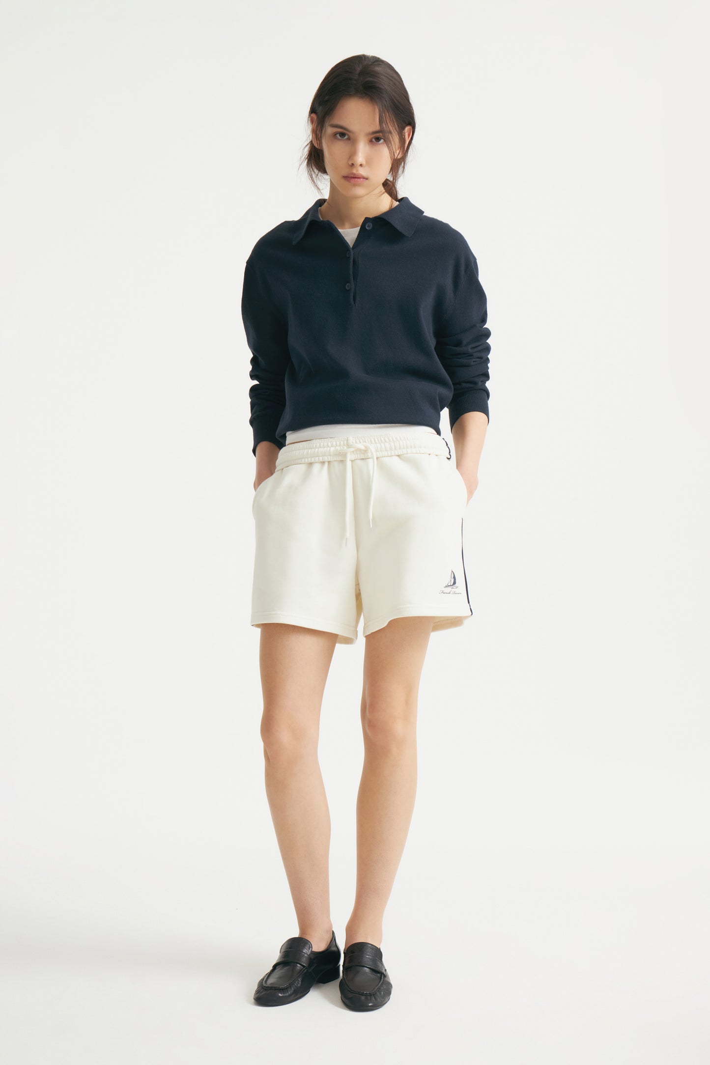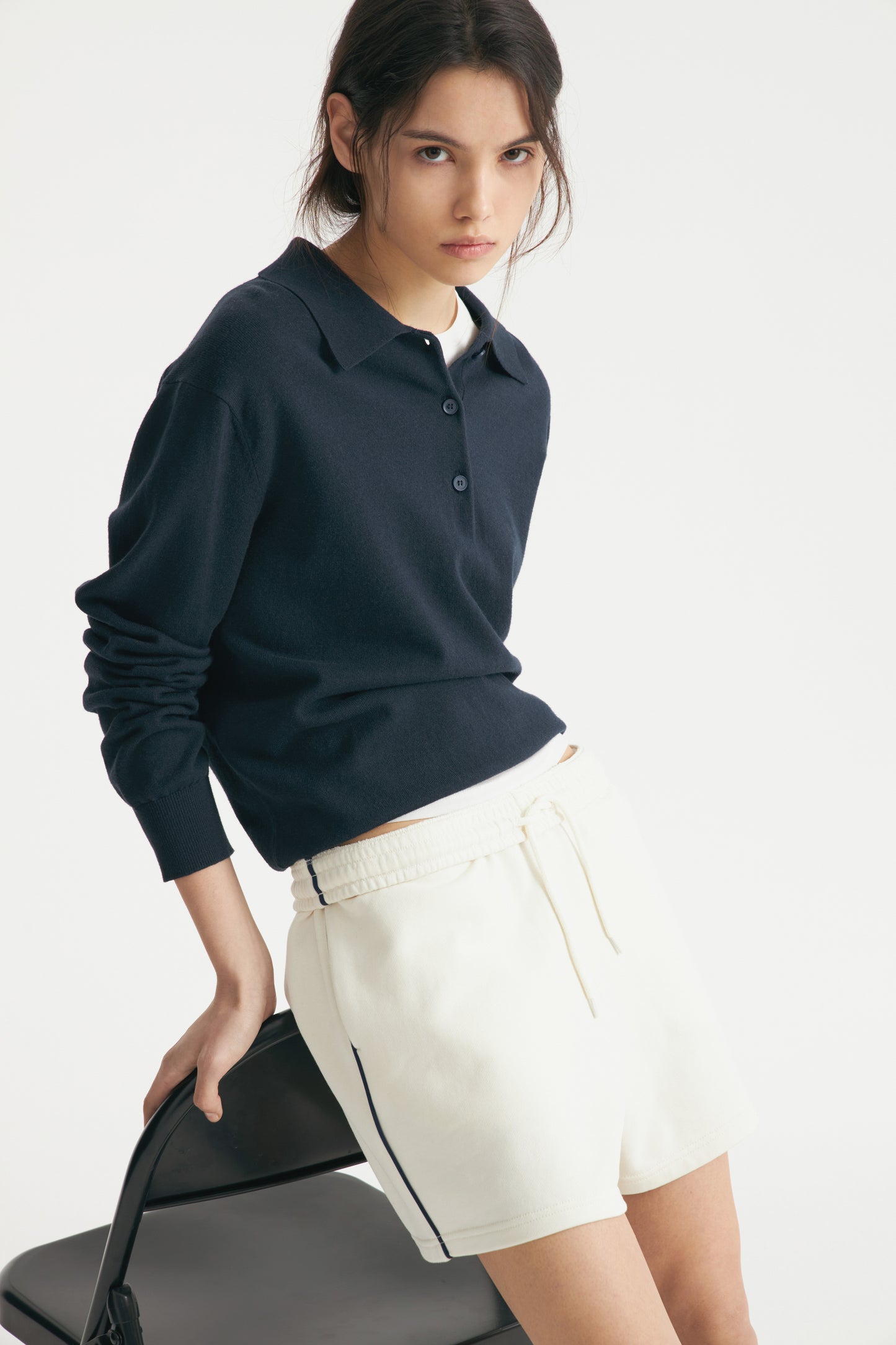 Shorts in a sweatshirt fabric made from cotton. Wide-leg design with an elasticated waist and front pockets. Feature a contrast trims and print motif on the front.