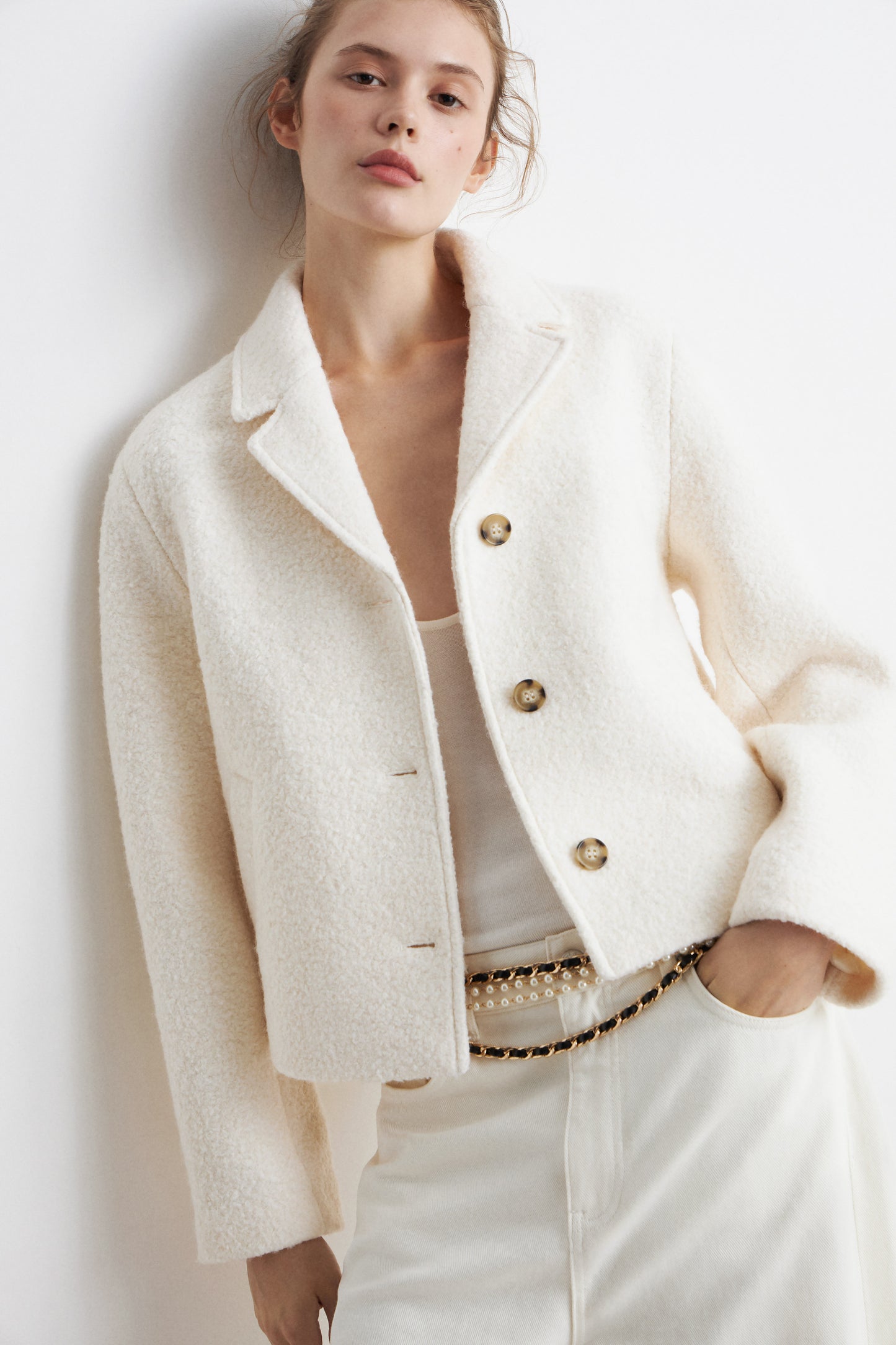 Short, singl-breasted jacket in a wool blend jersey. Notched lapels and long sleeves. Welt front pockets. Lined. Oversize fit. Buttons down the front.