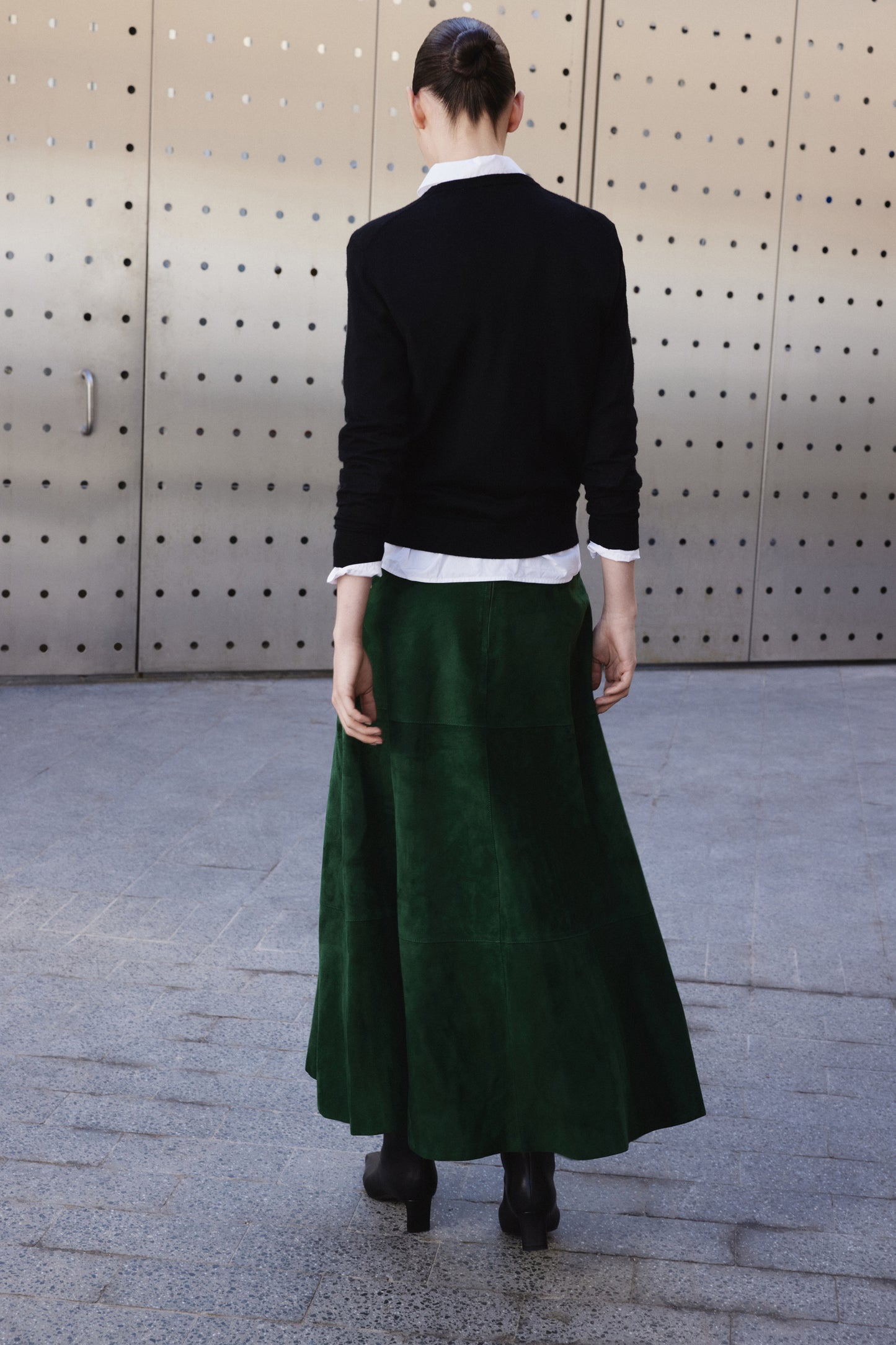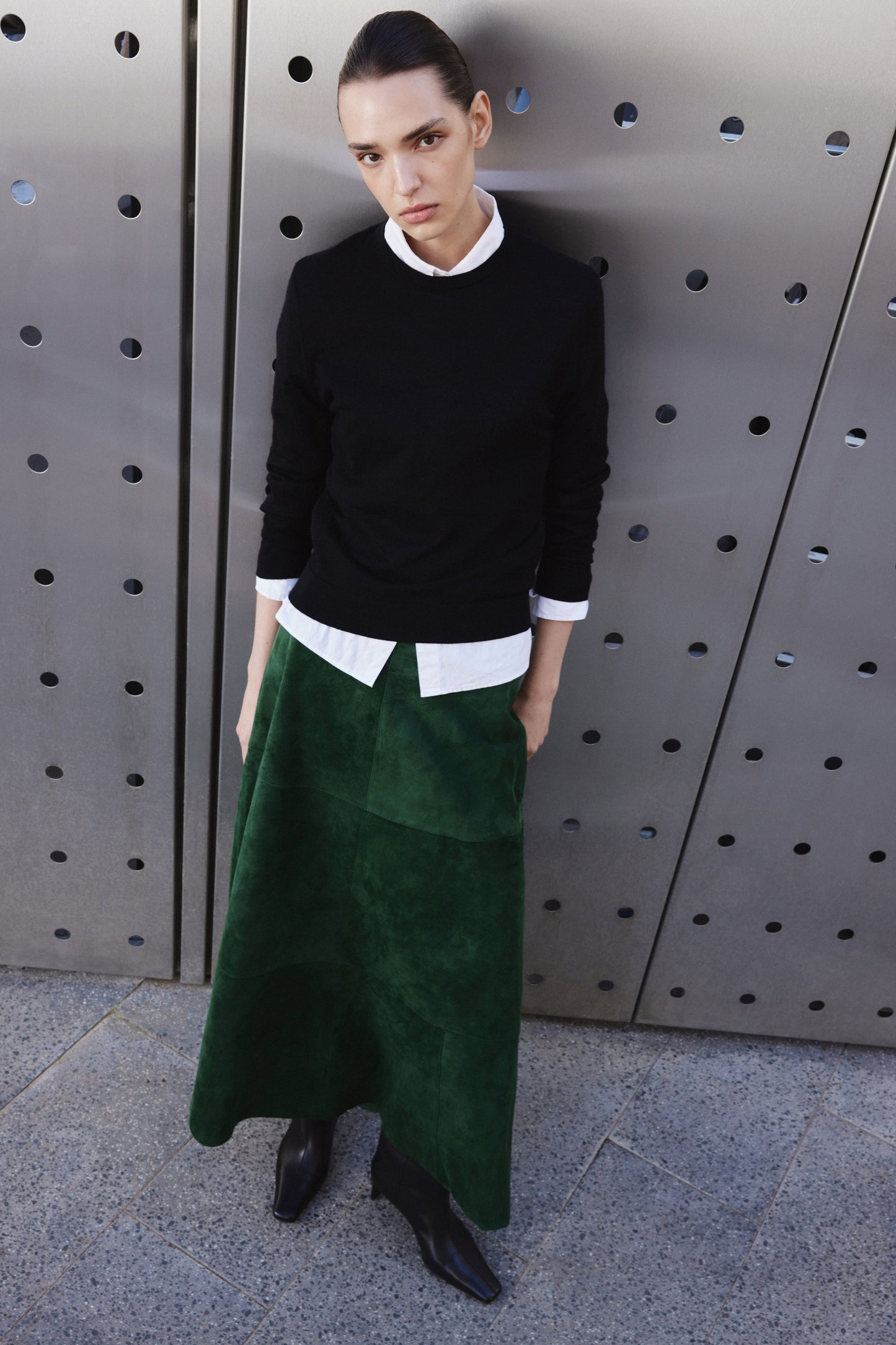 Sweater in a soft, fine-knit wool with long sleeves. Ribbing at neckline, cuffs, and hem.