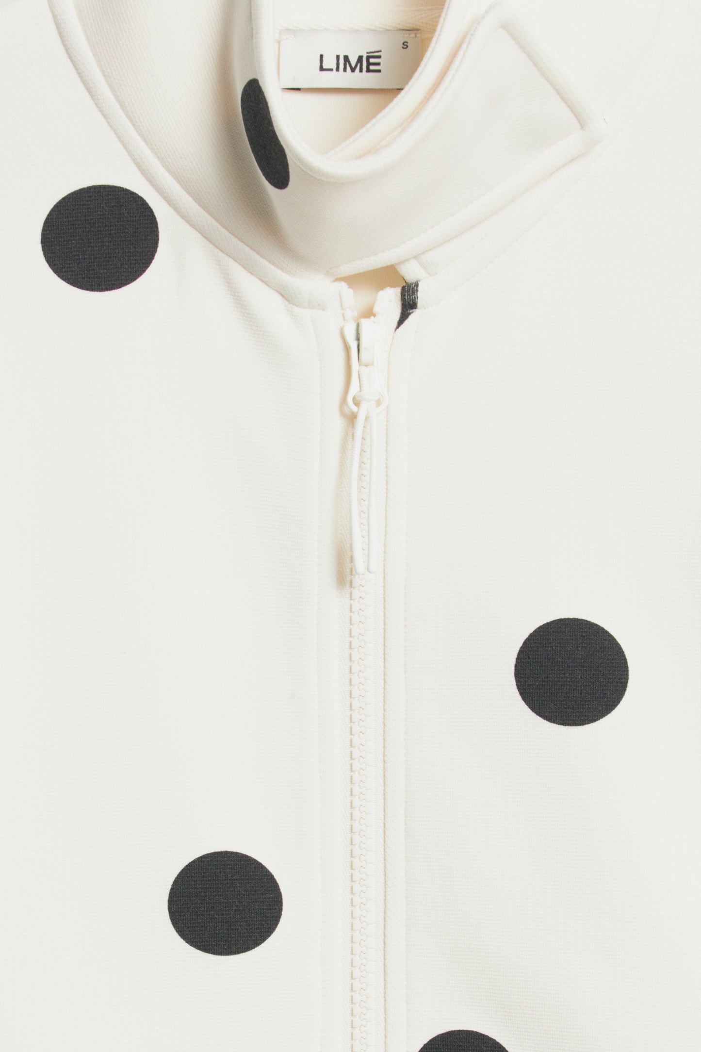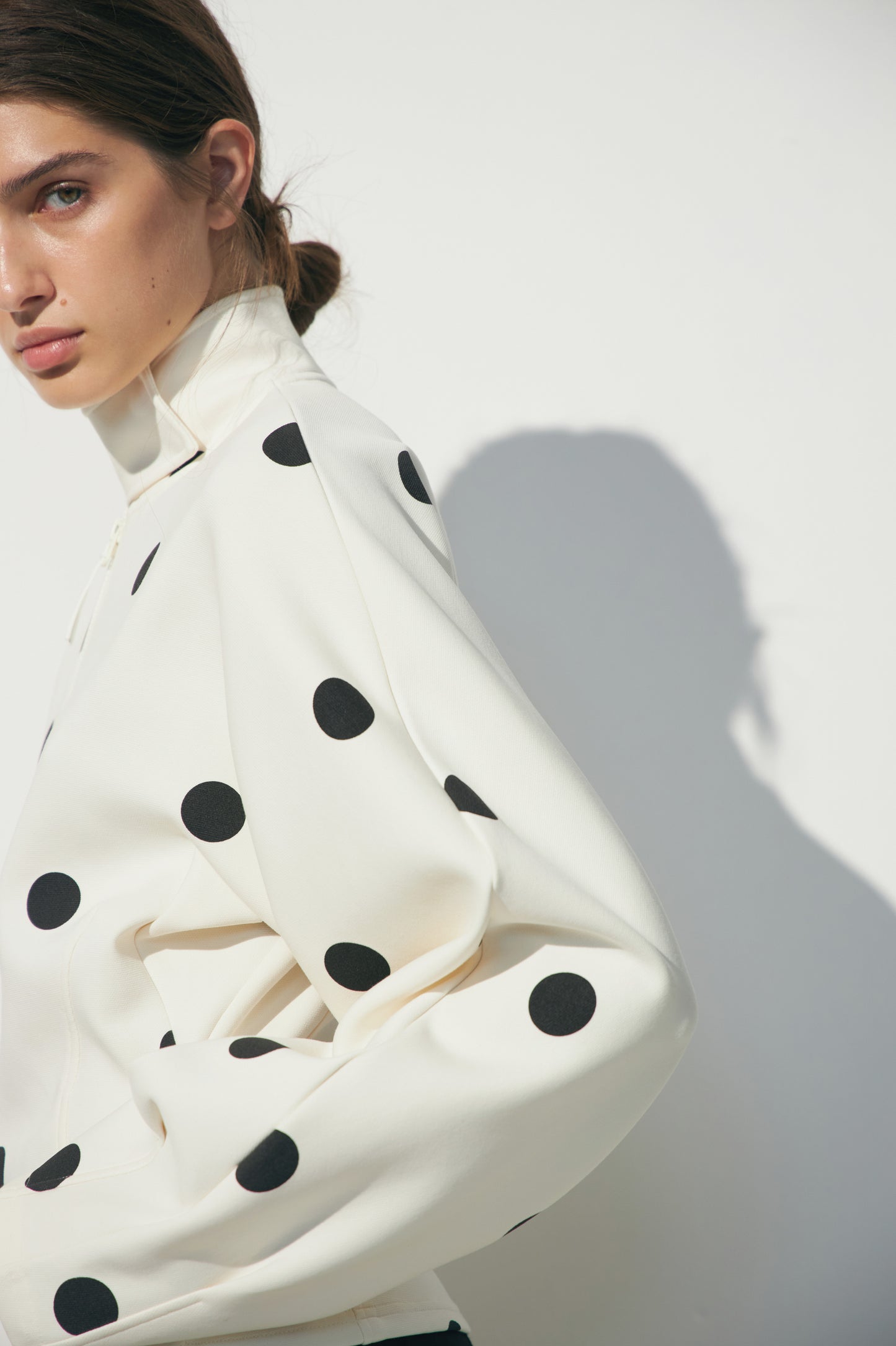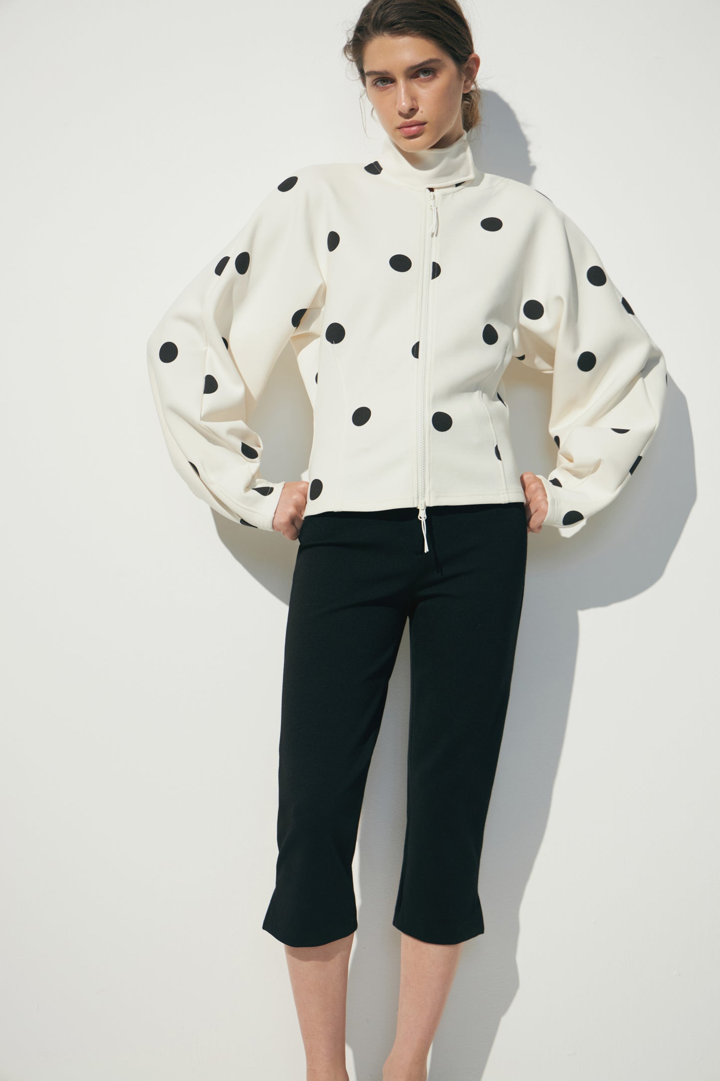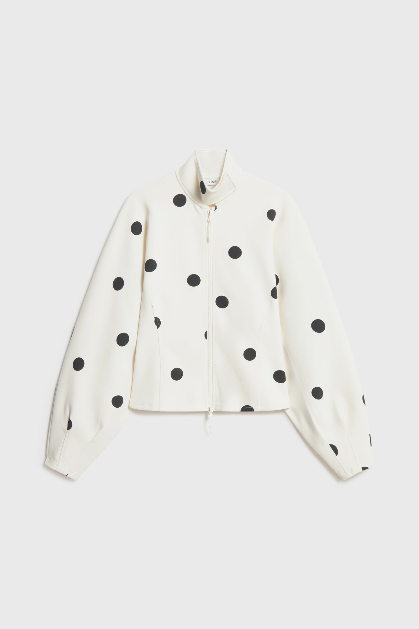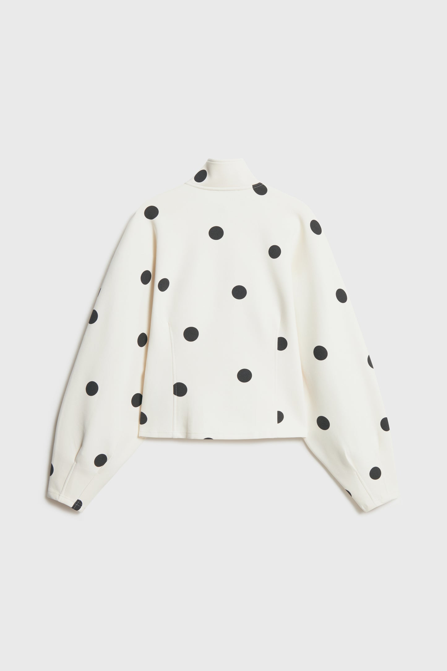 Fitted sweatshirt in interlock jersey. Stand-up collar, zipper on the front, long voluminous sleeves, and shaping side seams.